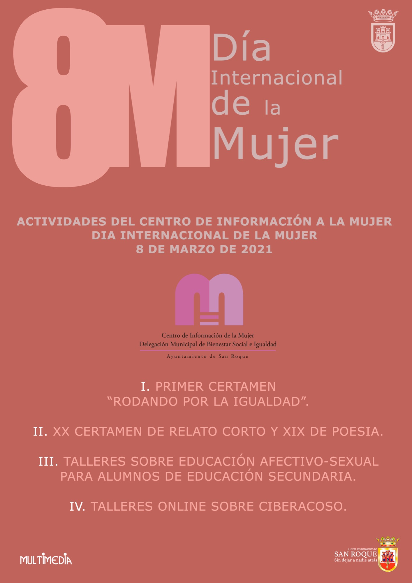 San Roque celebrará, un año más, el 8 de Marzo, Día Internacional de la Mujer, con distintas actividades. La novedad frente a ediciones anteriores es que, debido a la situación de pandemia, no habrá actos que puedan congregar a numeroso público, por lo que se ha optado por potenciar el uso de las nuevas tecnologías. Así, habrá un certamen de vídeos en Tik Tok, los tradicionales concursos de poesía y relatos cortos y dos talleres dirigidos al alumnado de ESO.