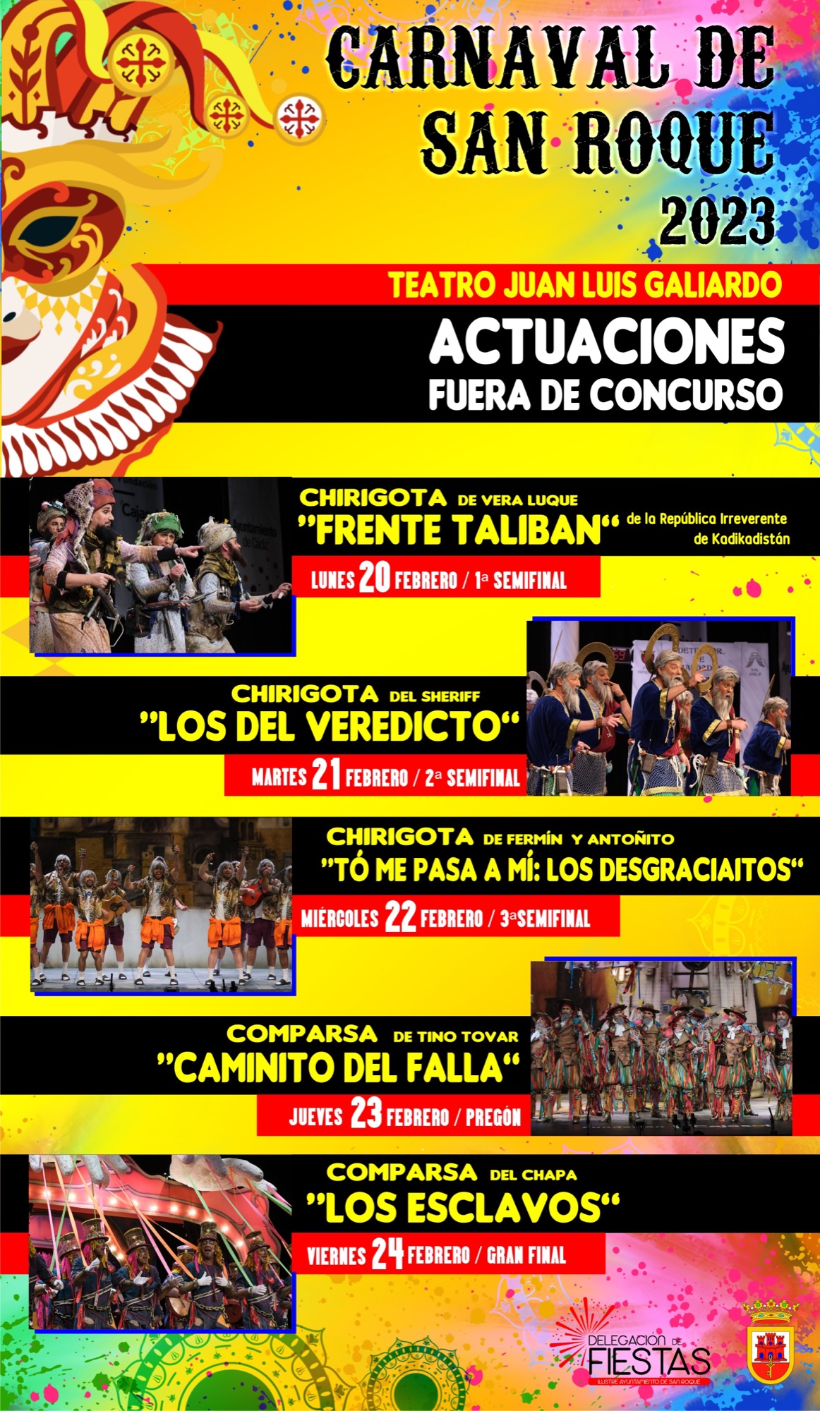 Este fin de semana se inicia en Campamento, Puente Mayorga, Estación y Taraguilla el Carnaval de San Roque y Barriadas 2023, que incluirá el Concurso de Agrupaciones y el Pregón en el Teatro Juan Luis Galiardo entre los días 20 y 24, y finalizará el fin de semana del 25 y 26 en Guadiaro y San Roque Ciudad. Nueve días de actividades organizadas por la Delegación de Fiestas.