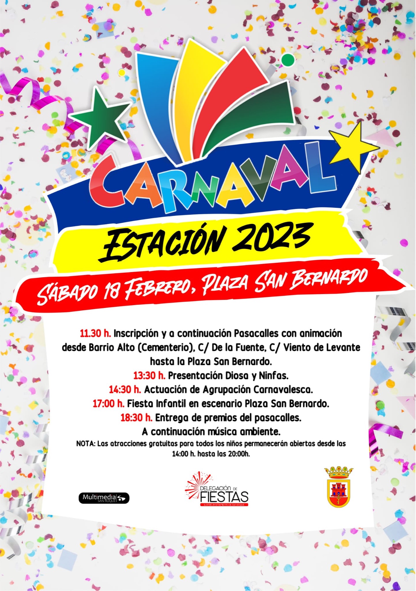 Respecto al Carnaval de Estación, se celebrará el sábado 18 en la Plaza de San Bernardo. A las 11.30 horas se llevará a cabo la inscripción para el concurso de disfraces, que se celebrará durante el tradicional Pasacalles con animación, el cual comenzará a la altura del cementerio (Barrio Alto), para seguir por las calles De la Fuente y Viento de Levante, para concluir en la Plaza de San Bernardo. A las 13.30 horas se llevará a cabo la presentación de la Diosa y de las Ninfas del Carnaval de la Estación de San Roque, y a las 14.30 está prevista la actuación de una agrupación carnavalesca.