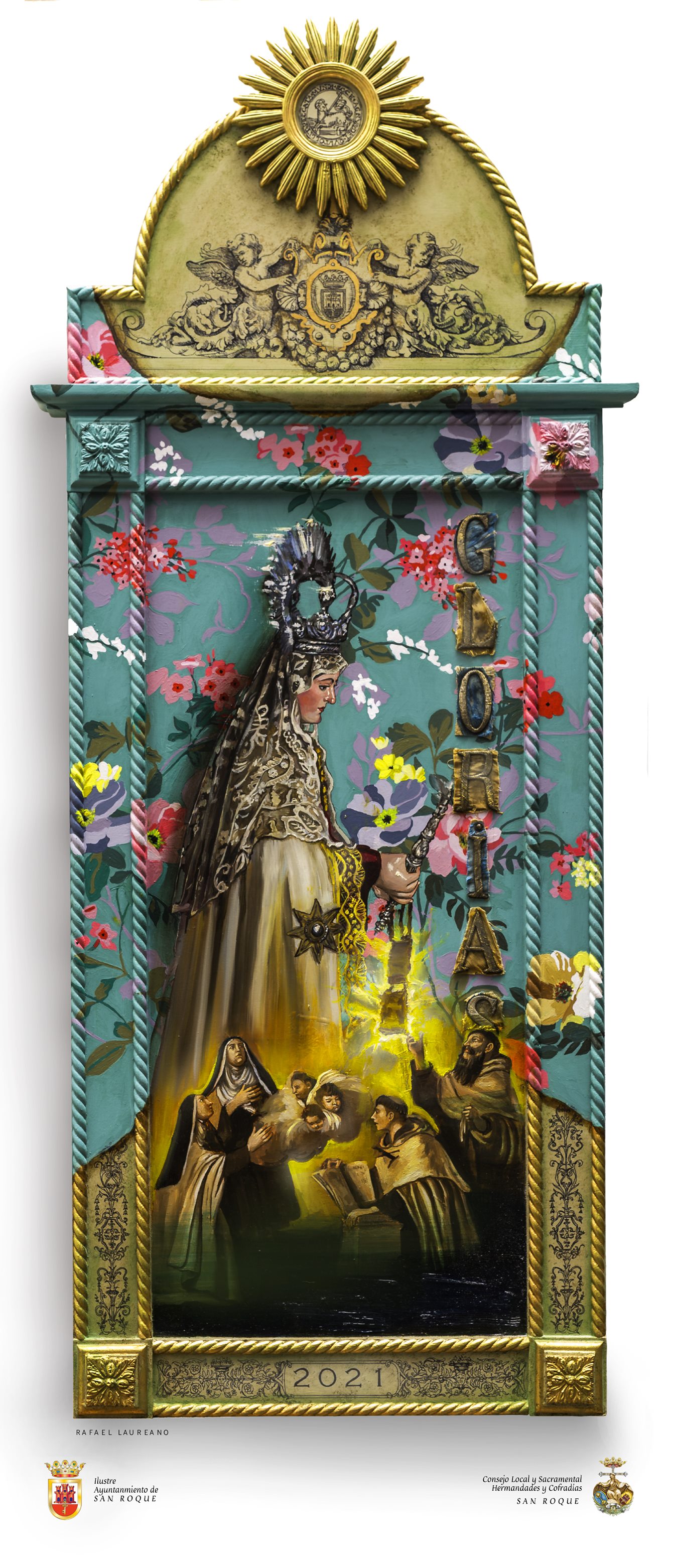 El autor explicó que “quería hacer algo distinto en esta ocasión, actualizando el arte a la época en la que vivimos, con la base de una imagen preciosa de la Virgen del Carmen, con santos carmelitas, con dos ángeles que sujetan una cartela con el escudo de San Roque".