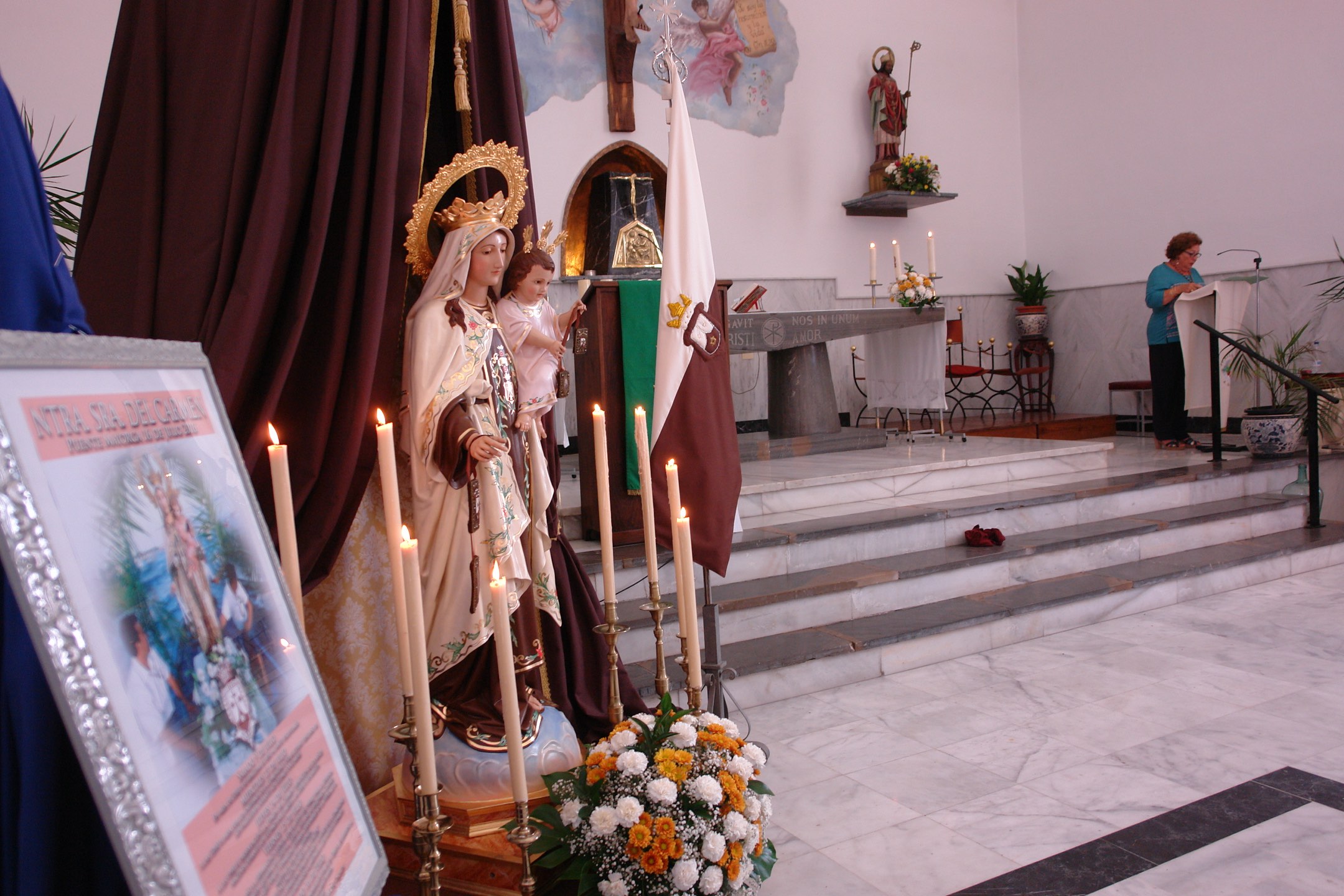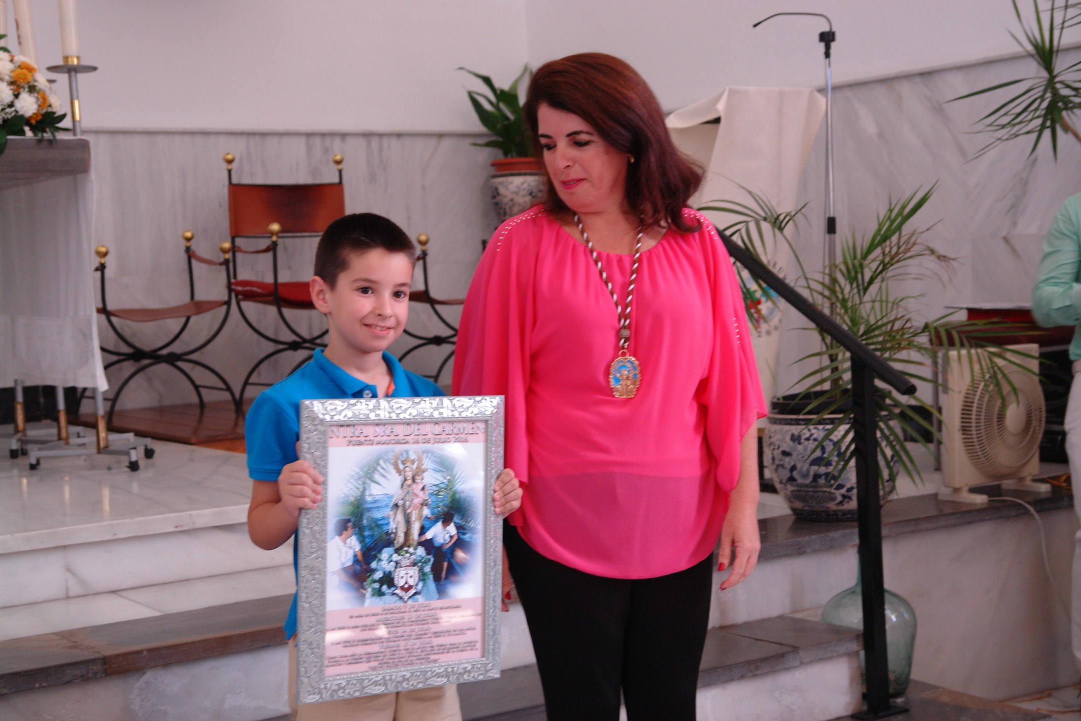 El momento emotivo del acto lo puso la entrega de un placa de reconocimiento a Margarita Gómez de Tejada, que fue largamente aplaudida por el público asistente, que llenaba la Iglesia, dada la enorme implicación de Margarita con la Virgen del Carmen.