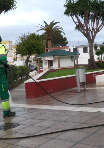Dos de los espacios elegidos durante esta jornada han sido las inmediaciones del Centro Salud Evaristo Dominguez, en la barrada de la Paz, centrándose en la plaza que hay frente al mismo y junto al edificio alcalde Andrés Merchán; y en la entrada del Centro de Salud de San Enrique. En ambos casos la limpieza y desinfección se ha llevado a cabo con mangueras de agua caliente a presión con cloro diluido, con el objetivo de arrastrar cualquier vestigio de virus que pudiera quedar en el pavimento.