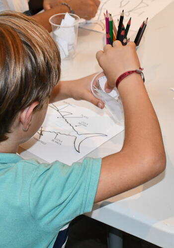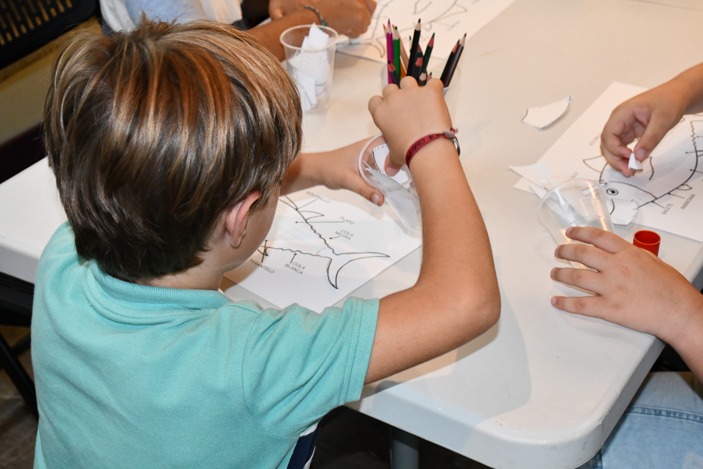 El taller comenzó con una explicación sobre la importancia de los atunes y de los salazones en la antigua Roma, así como sobre la relevancia de las costas del Estrecho en la pesca y en el comercio de estos productos. A continuación, se llevó a los pequeños a que vieran unas ánforas, para conocer sus usos y formas, y finalmente se les ofrecieron unas láminas en las que habían dibujadas un atún y un ánfora, y a las que los niños tenían que pegar distintas partes y colorearlas.