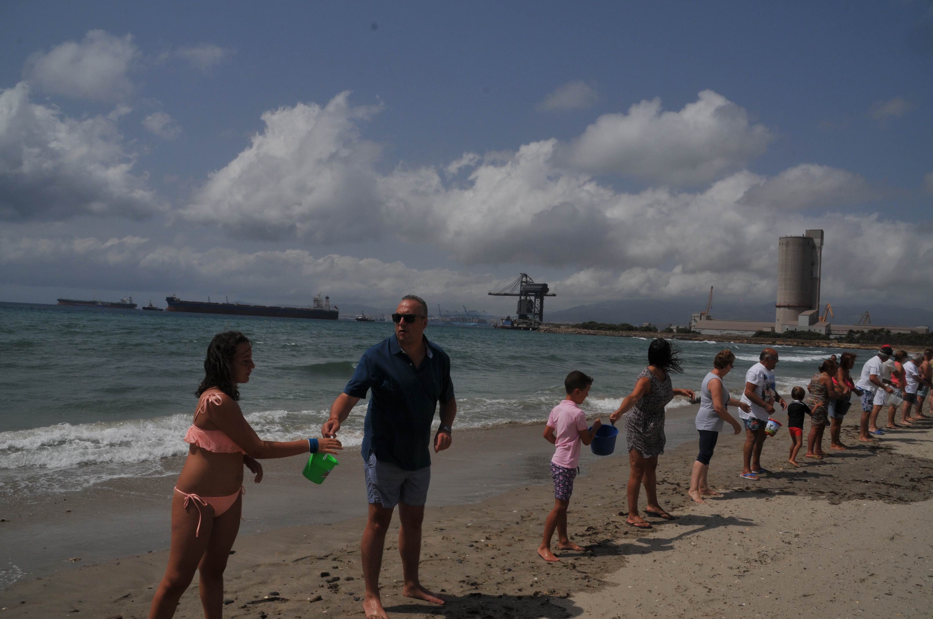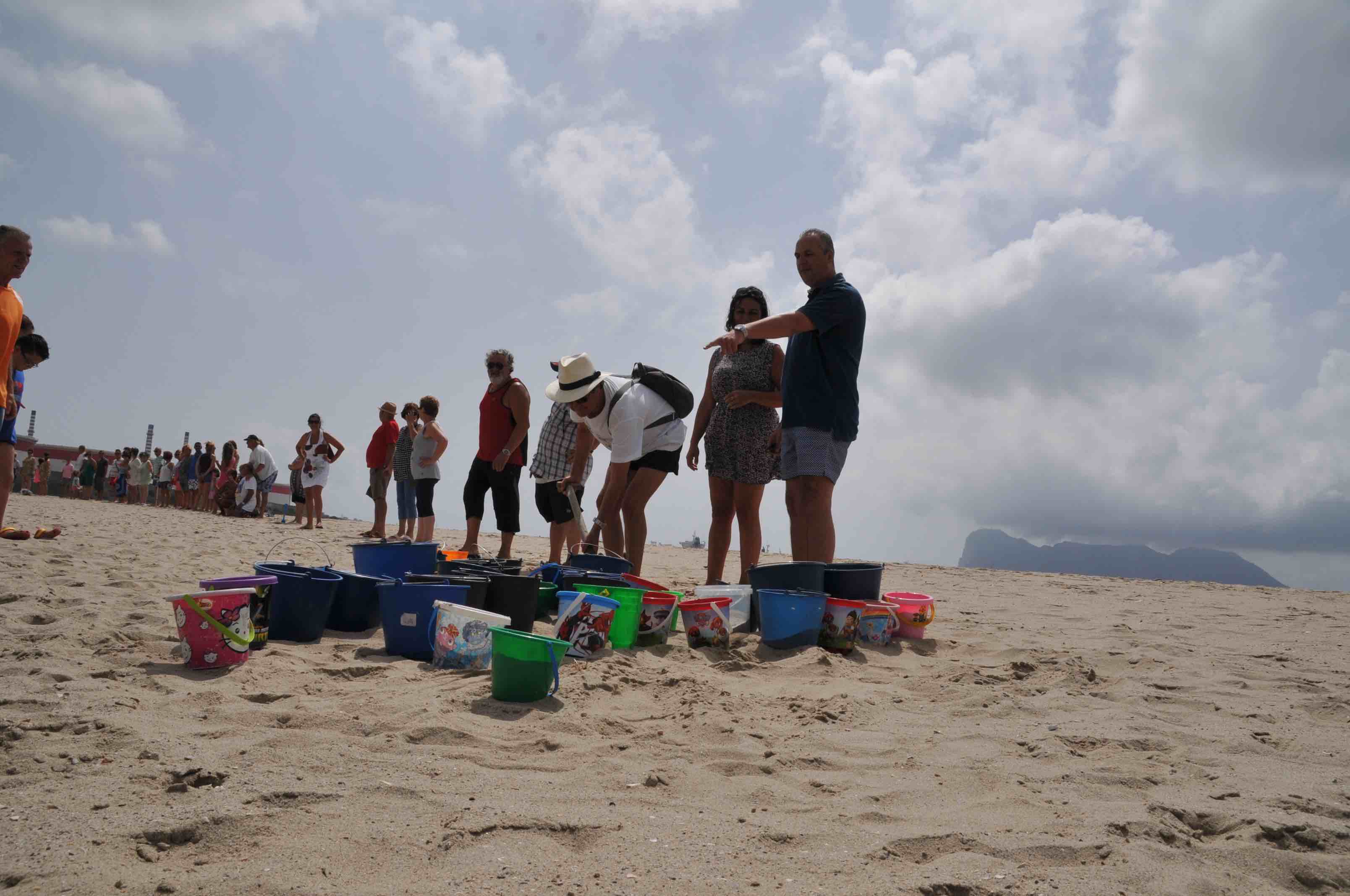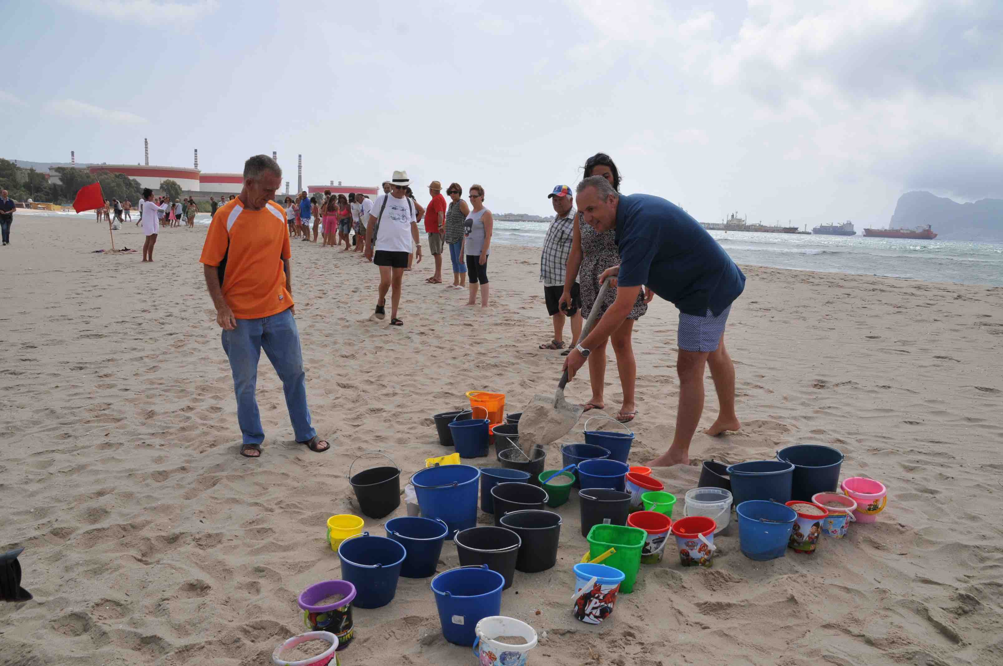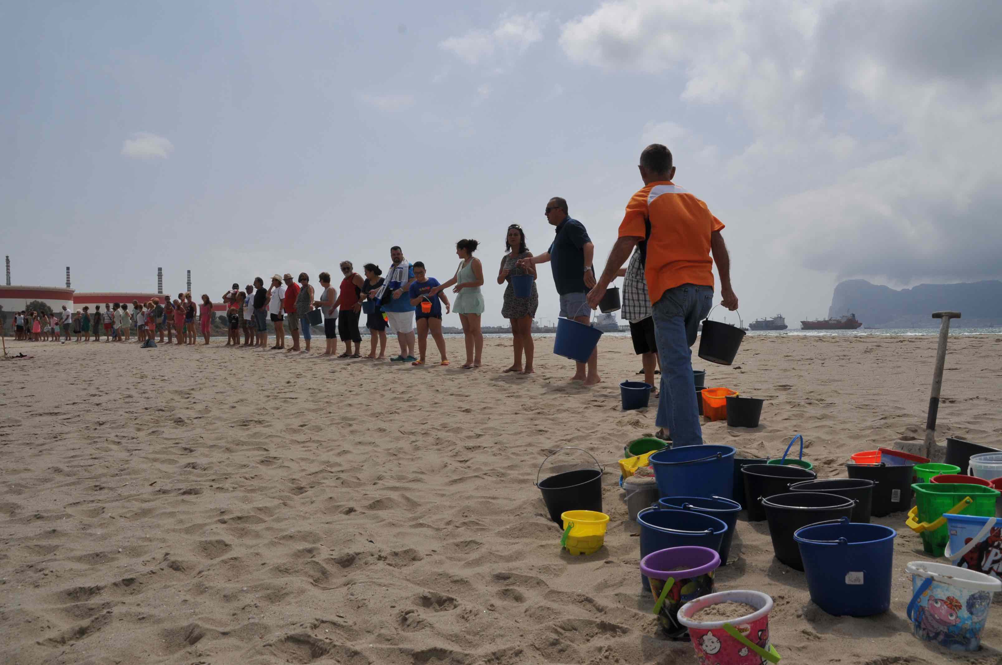 Vecinos de ambas barriadas, concejales del Ayuntamiento y bañistas que estaban en la playa han formado una cadena humana para trasladar en cubos de playa infantiles arena desde la desembocadura del rio Guadarranque hasta el fortín existente en el otro extremo de la playa.