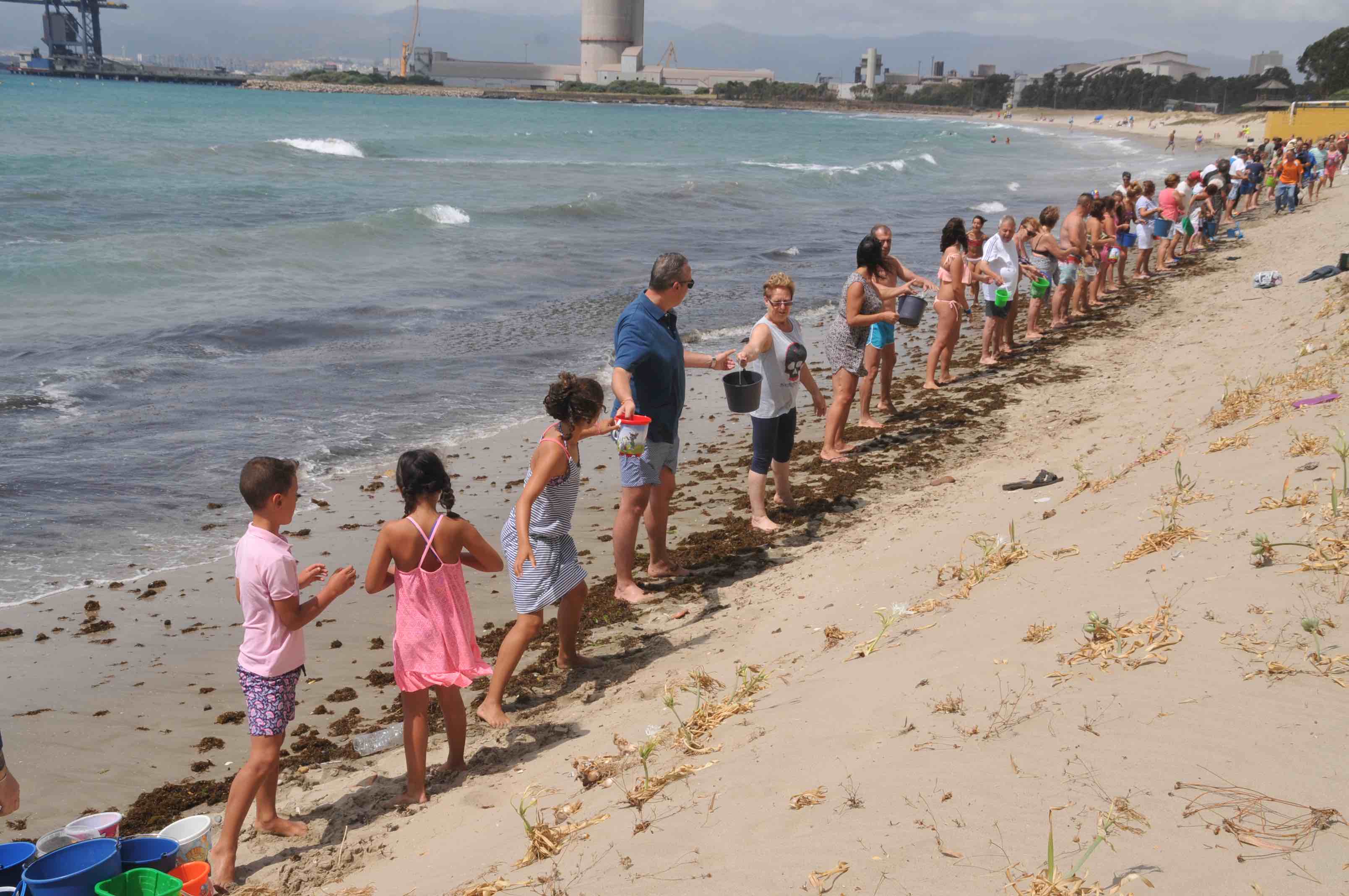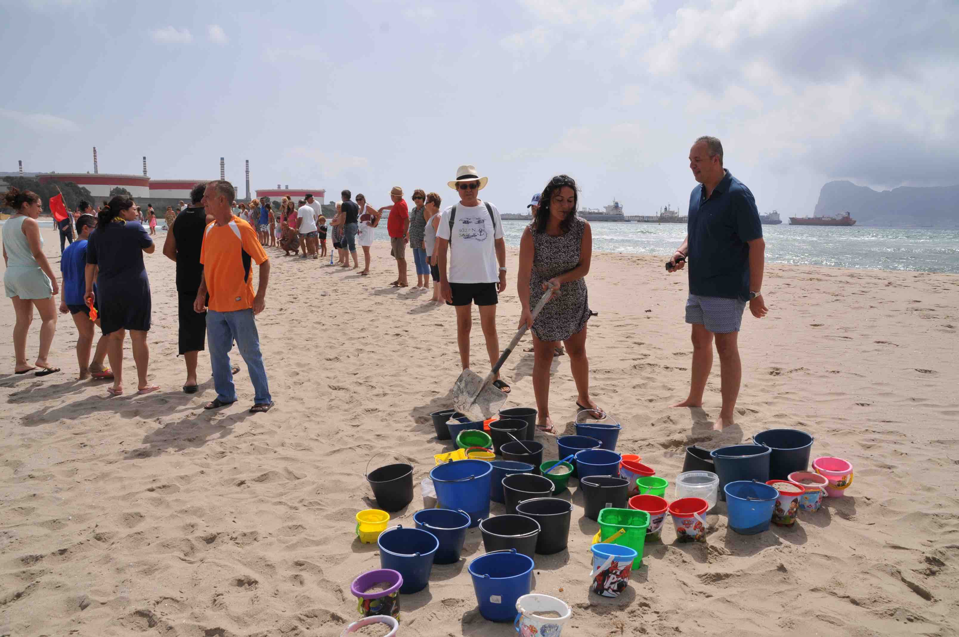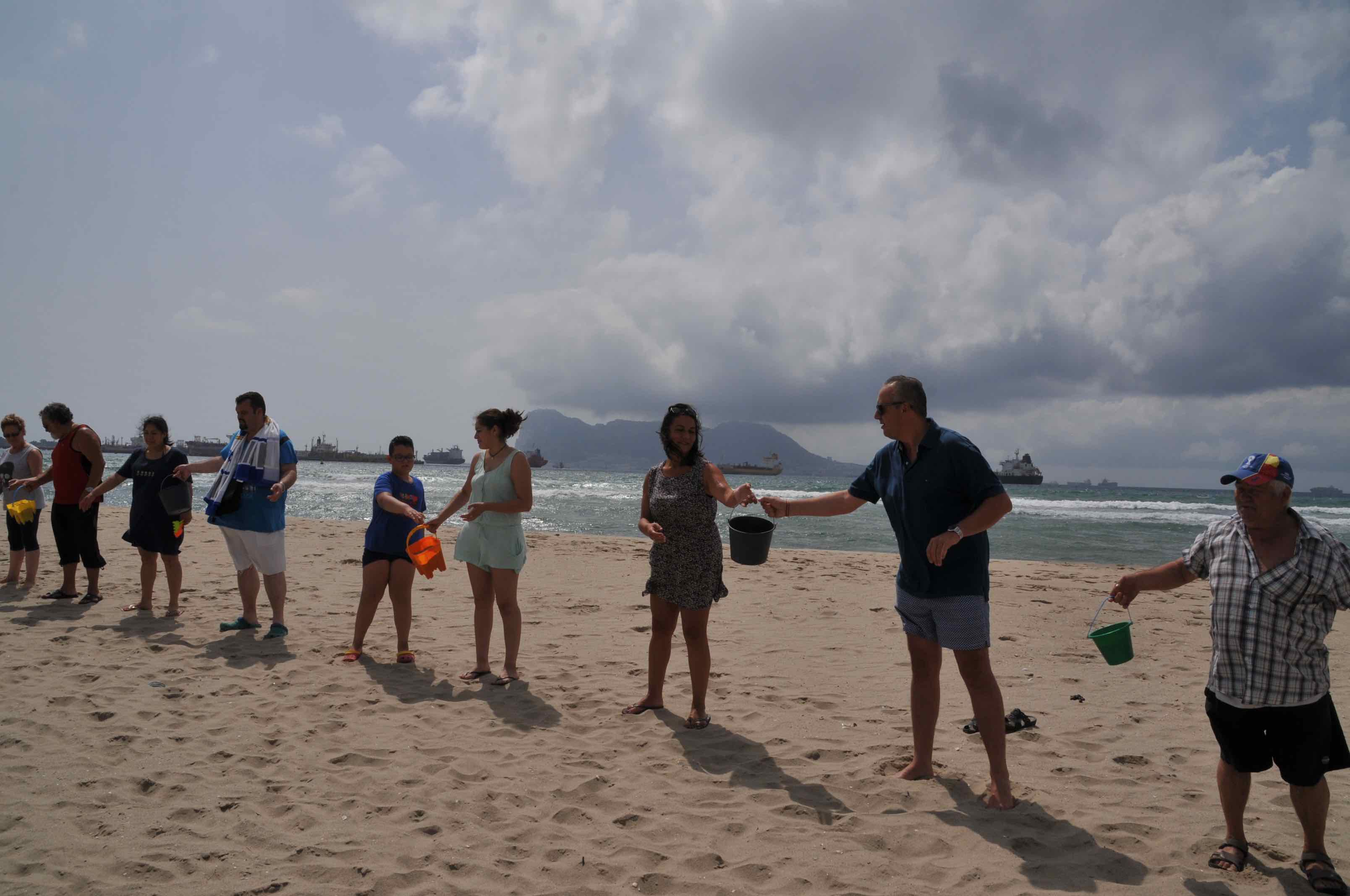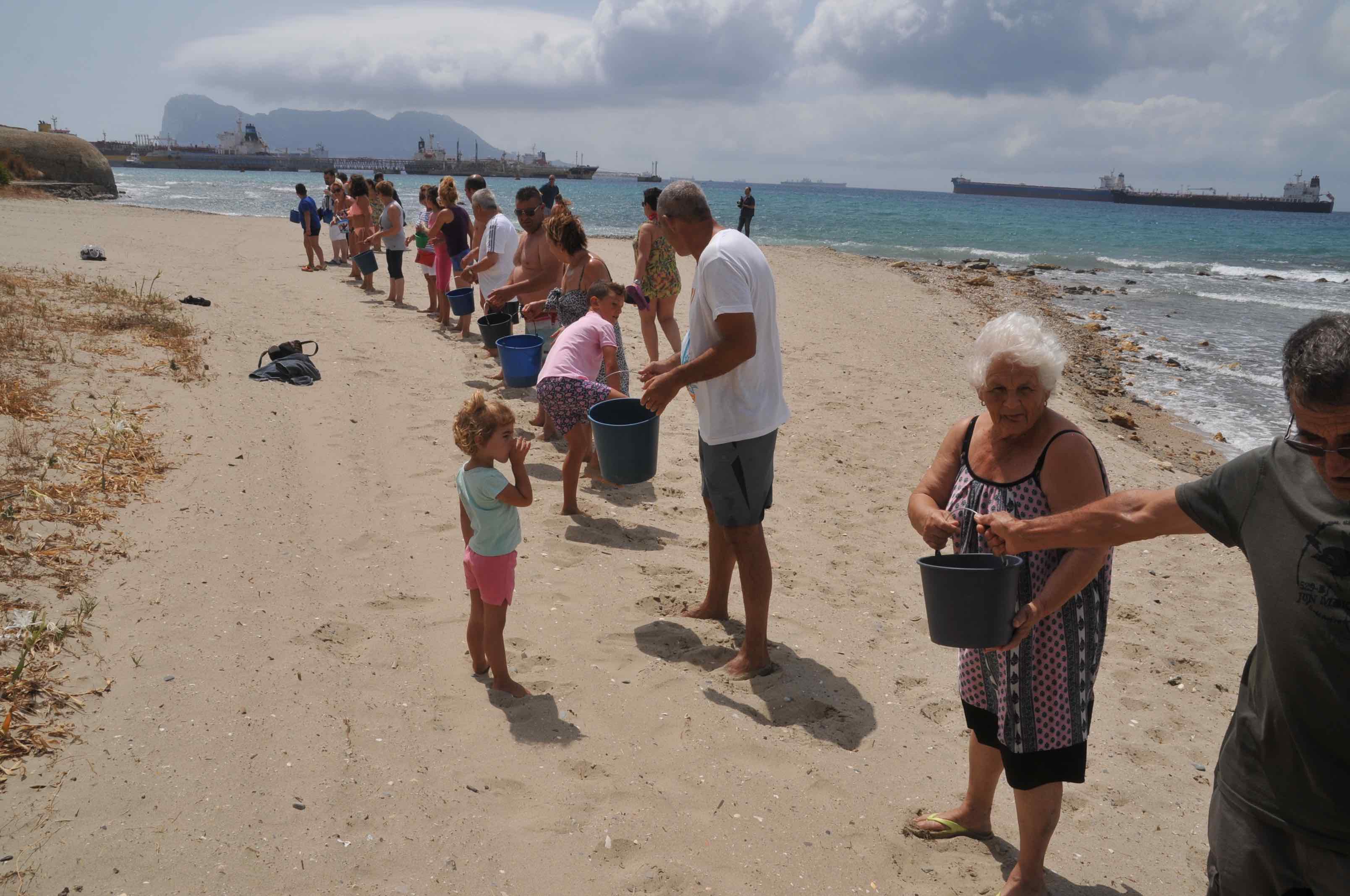 Vecinos de ambas barriadas, concejales del Ayuntamiento y bañistas que estaban en la playa han formado una cadena humana para trasladar en cubos de playa infantiles arena desde la desembocadura del rio Guadarranque hasta el fortín existente en el otro extremo de la playa.