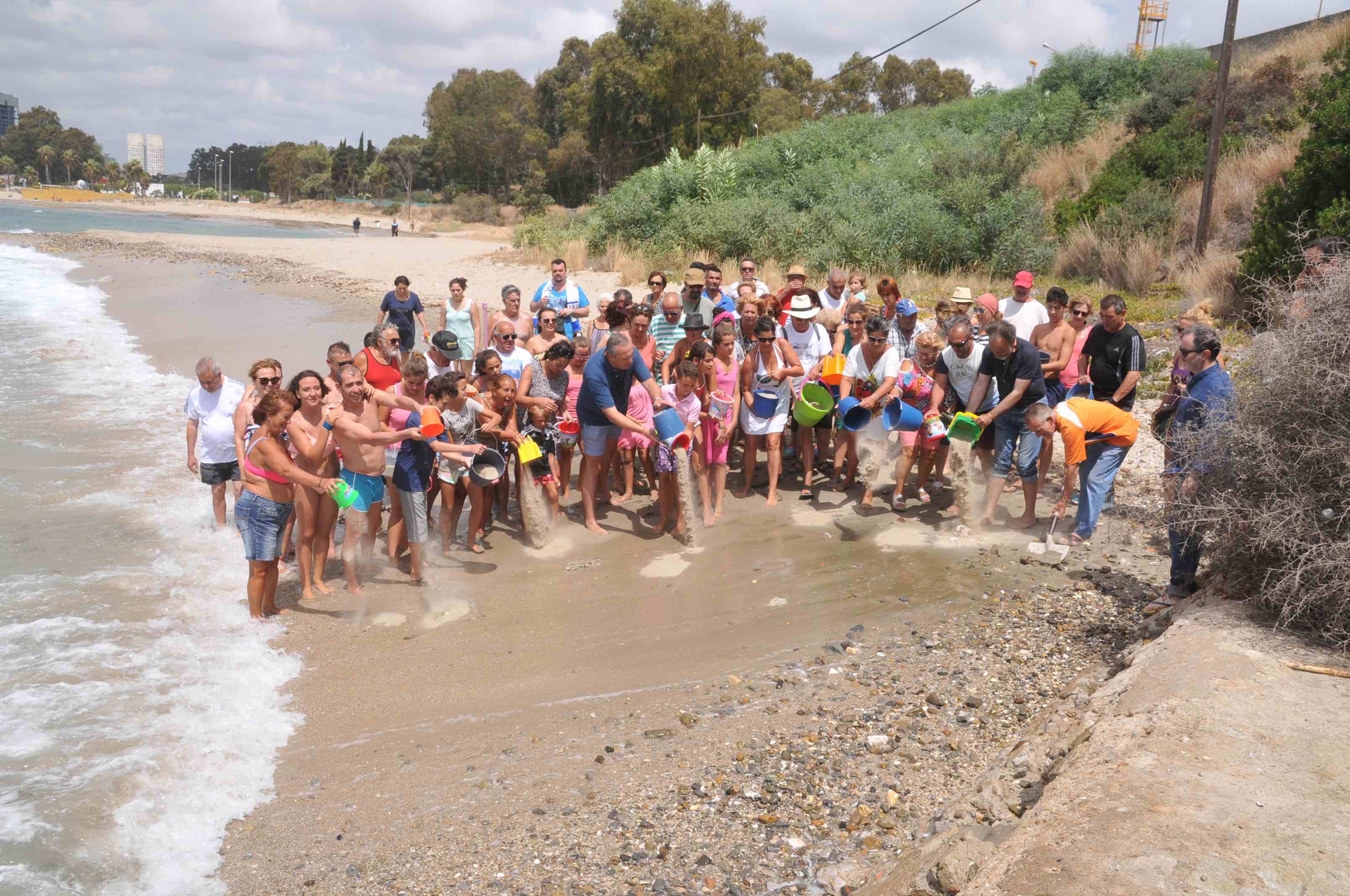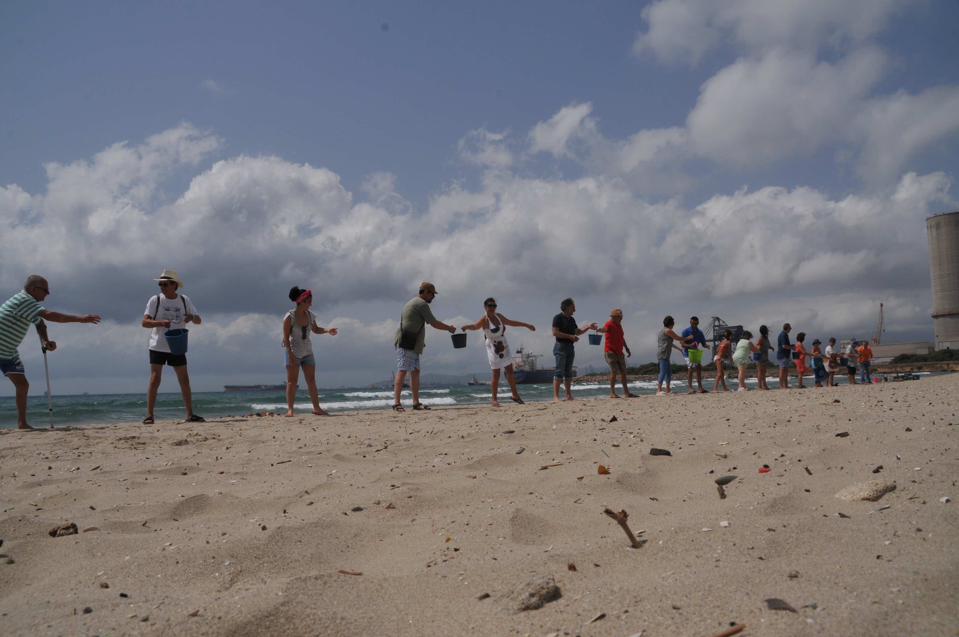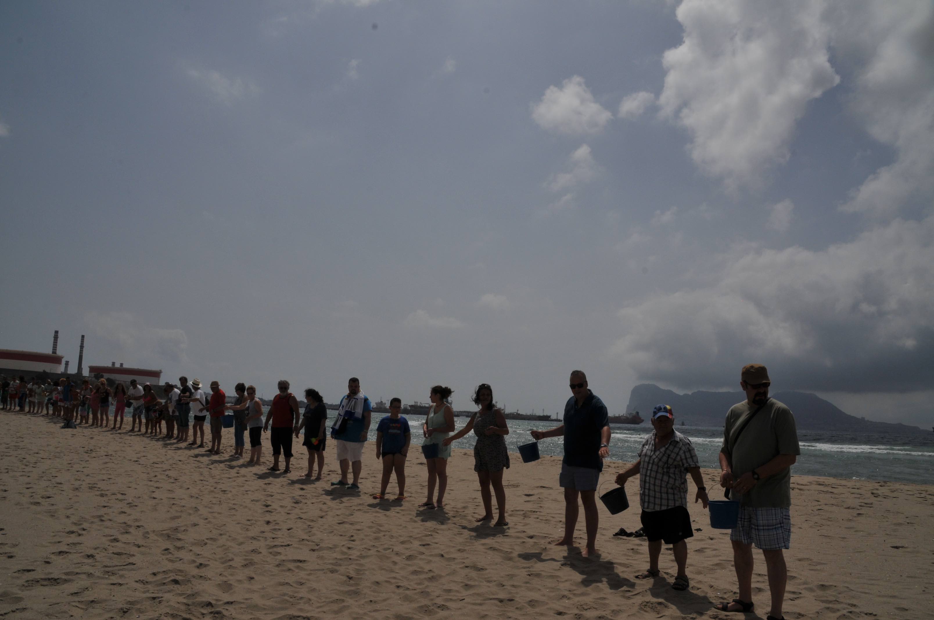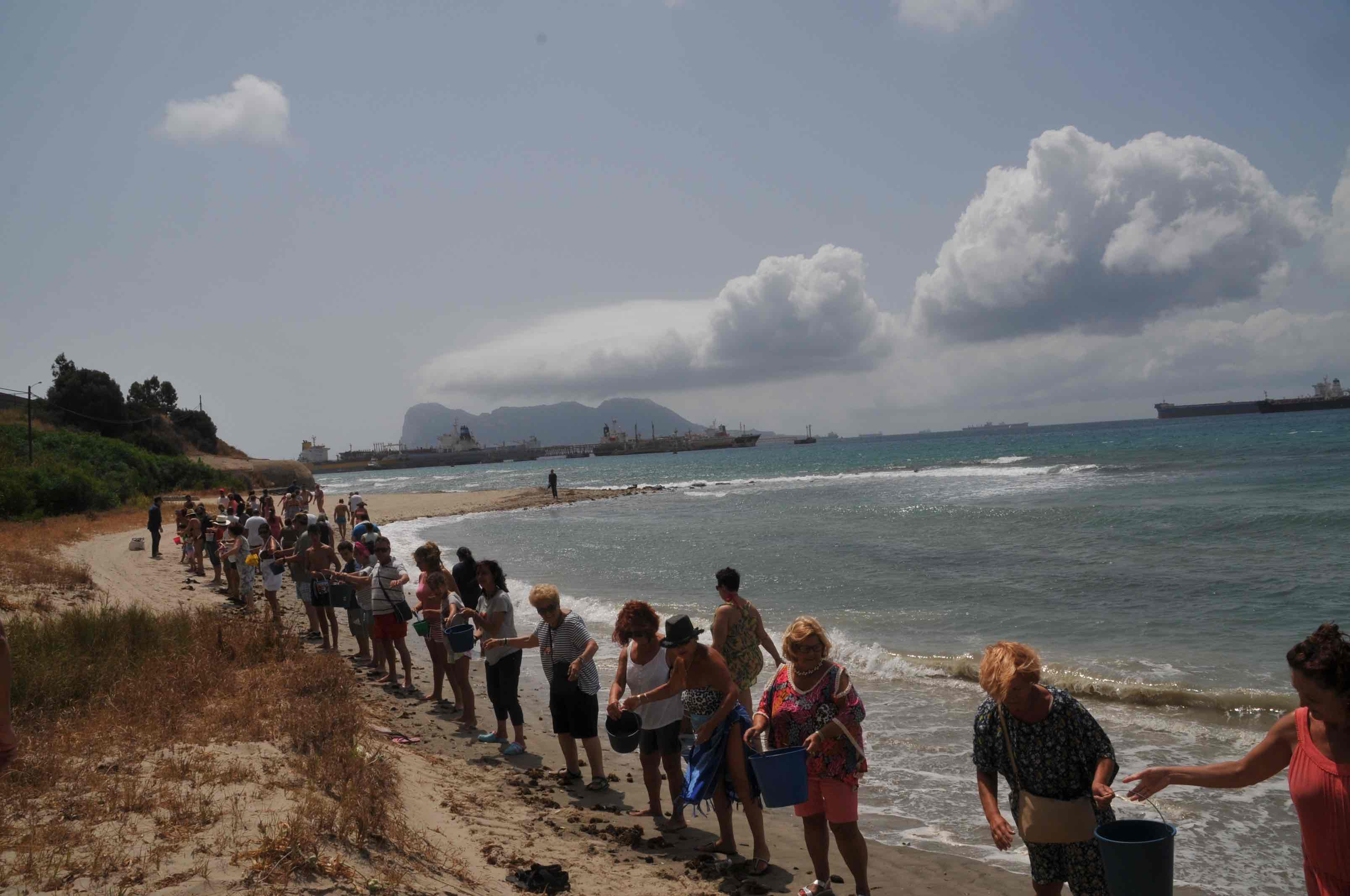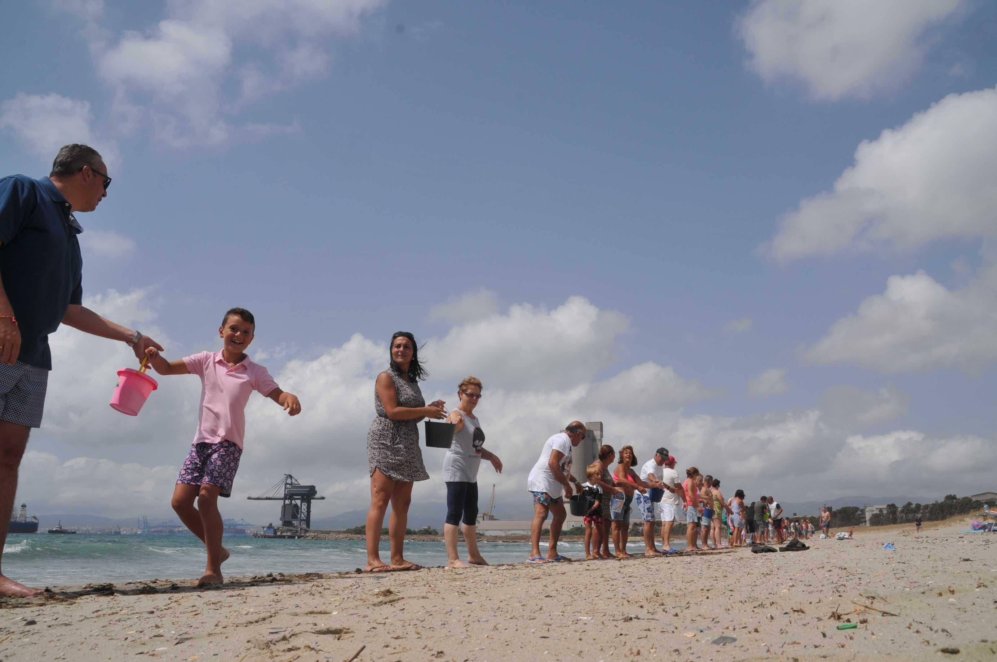 Vecinos de ambas barriadas, concejales del Ayuntamiento y bañistas que estaban en la playa han formado una cadena humana para trasladar en cubos de playa infantiles arena desde la desembocadura del rio Guadarranque hasta el fortín existente en el otro extremo de la playa.
