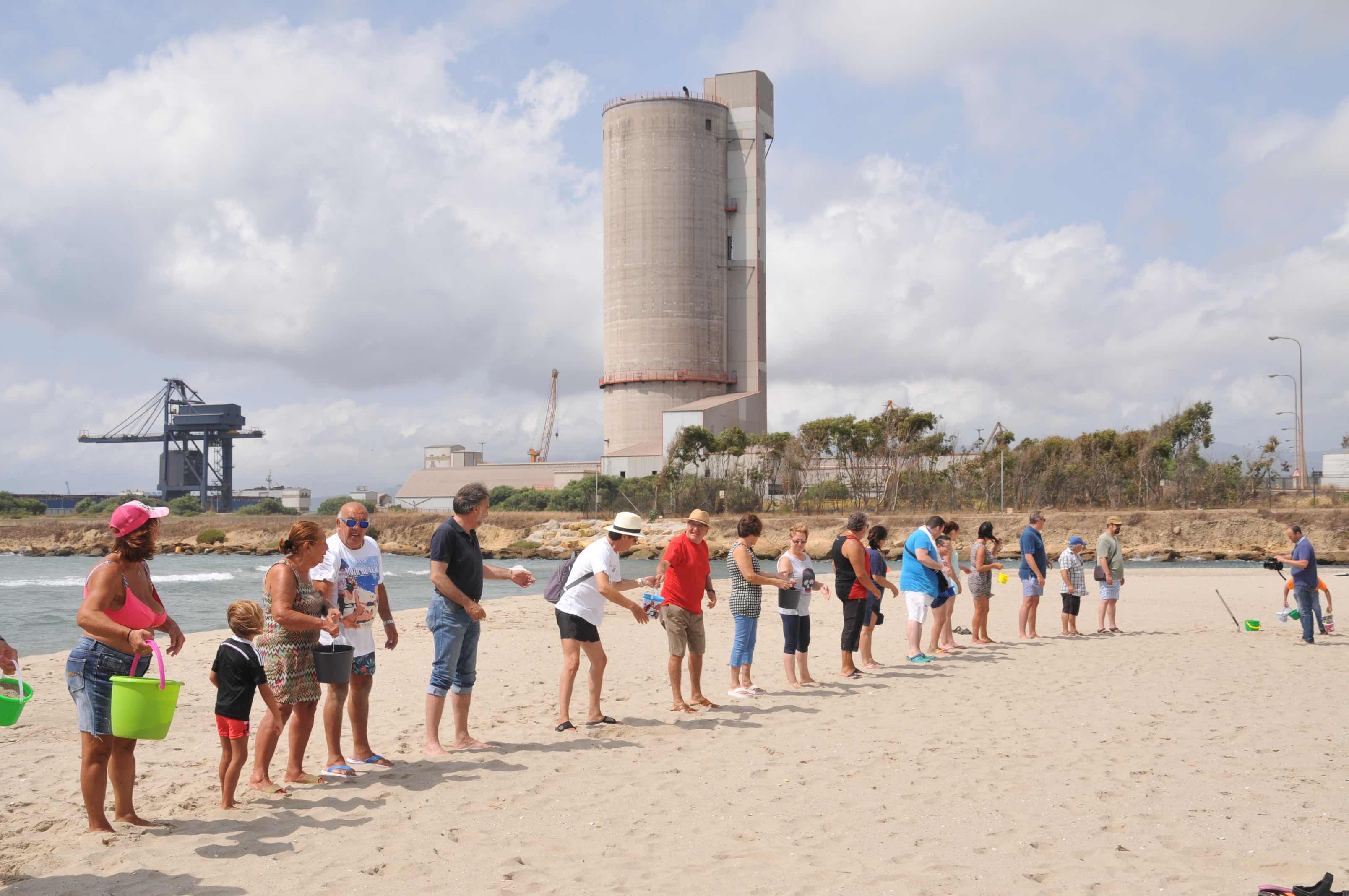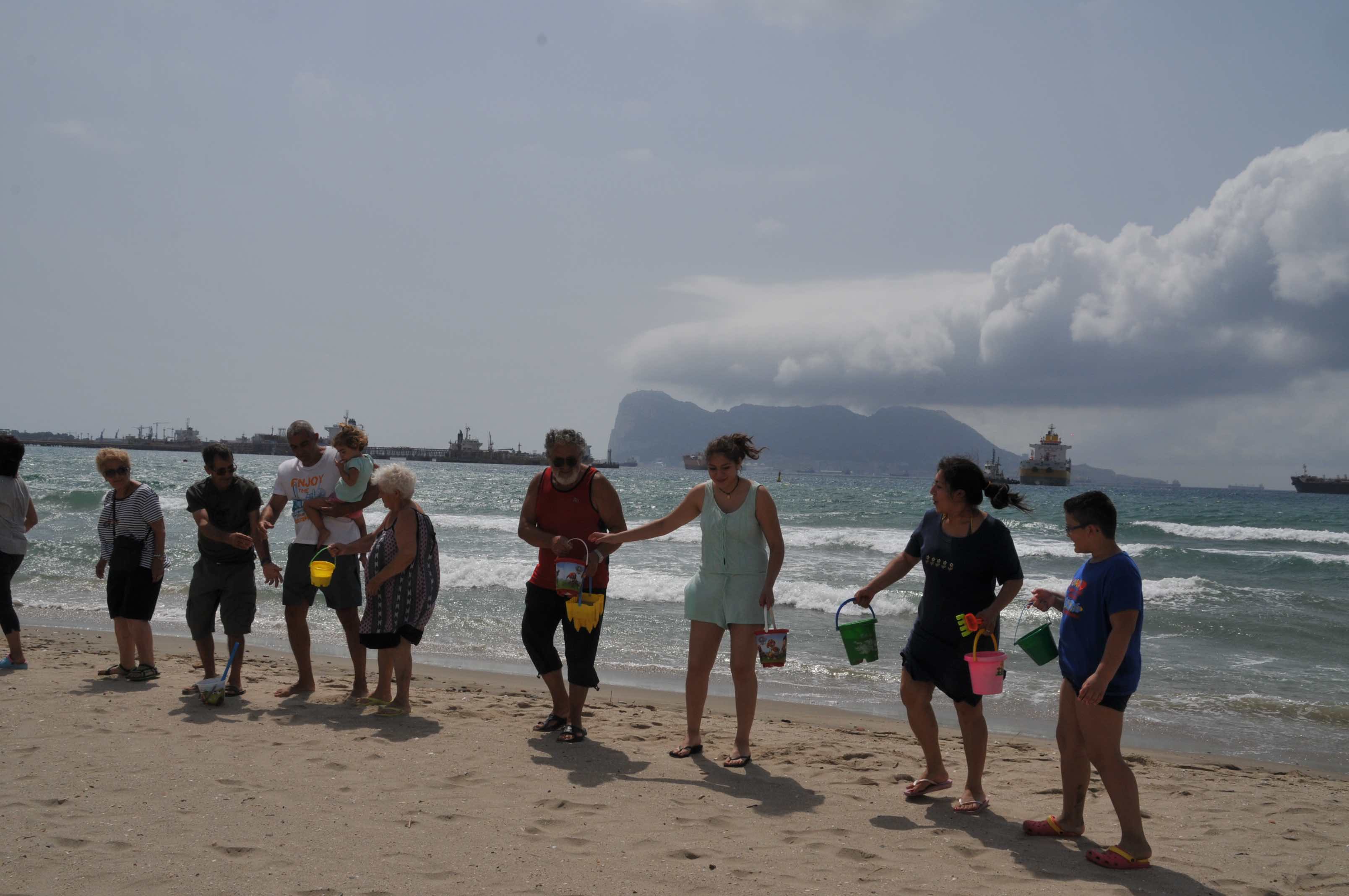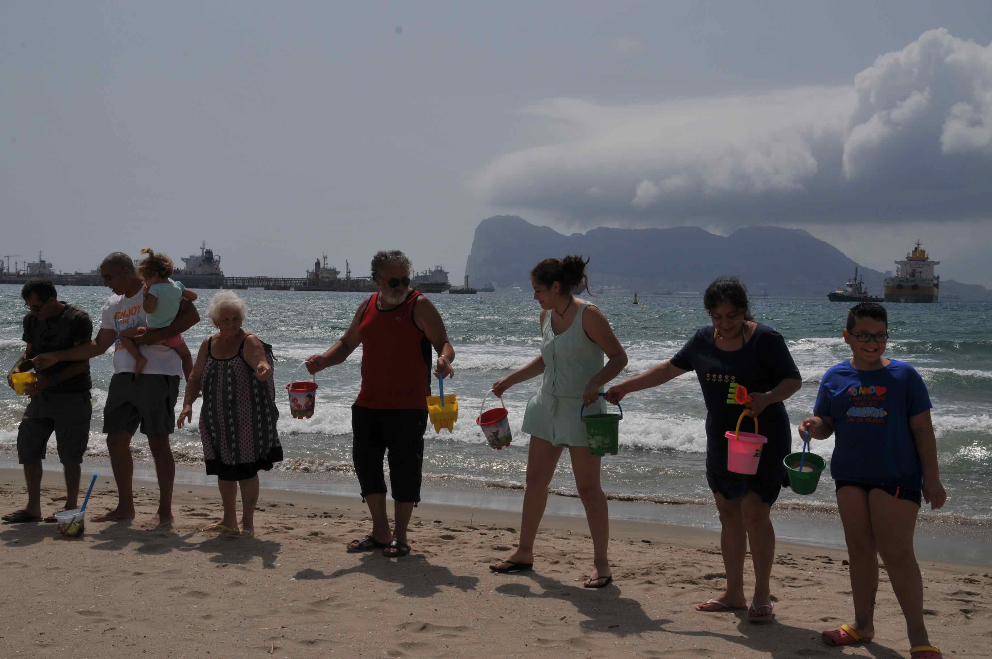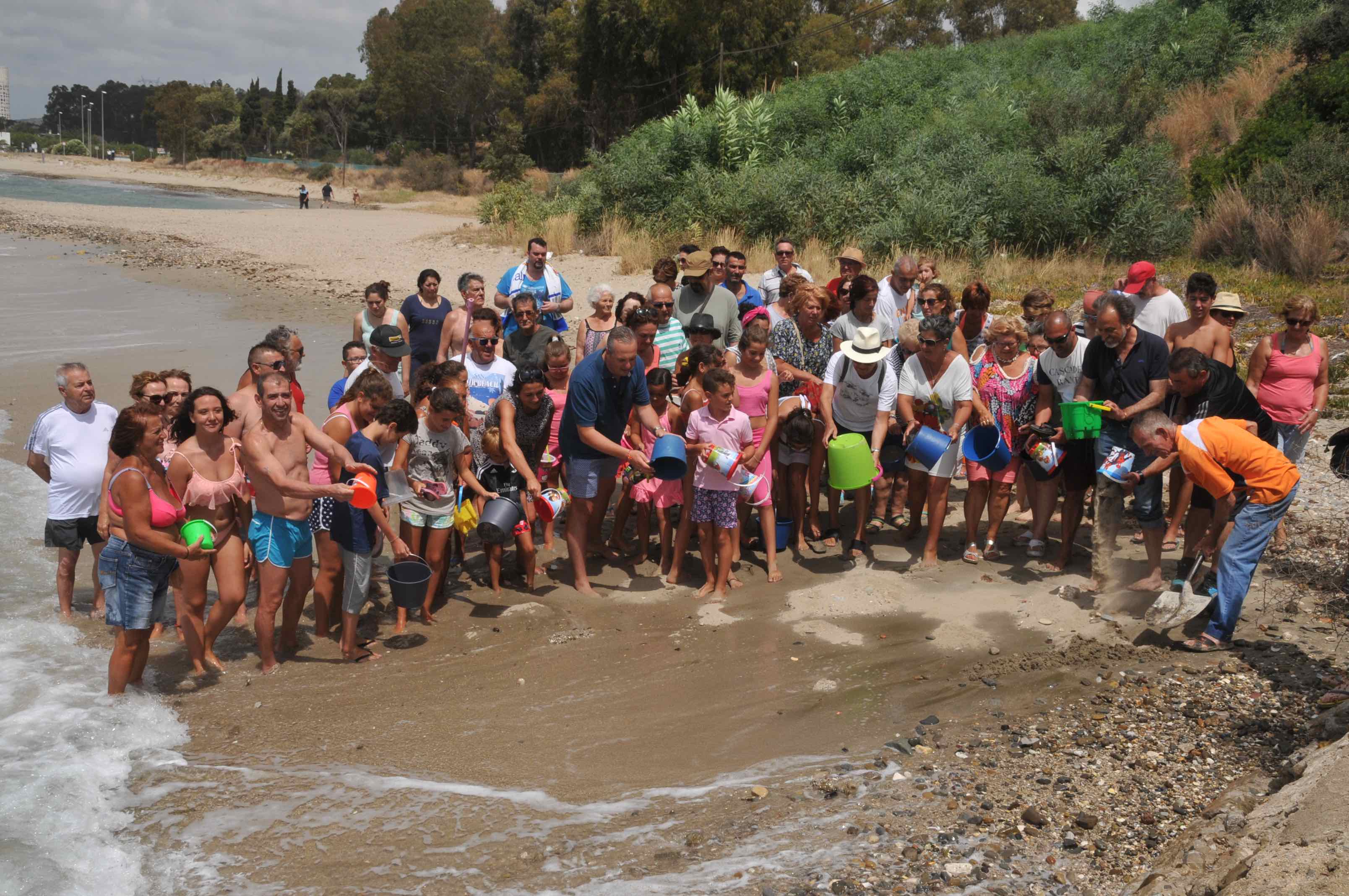 Vecinos de ambas barriadas, concejales del Ayuntamiento y bañistas que estaban en la playa han formado una cadena humana para trasladar en cubos de playa infantiles arena desde la desembocadura del rio Guadarranque hasta el fortín existente en el otro extremo de la playa.