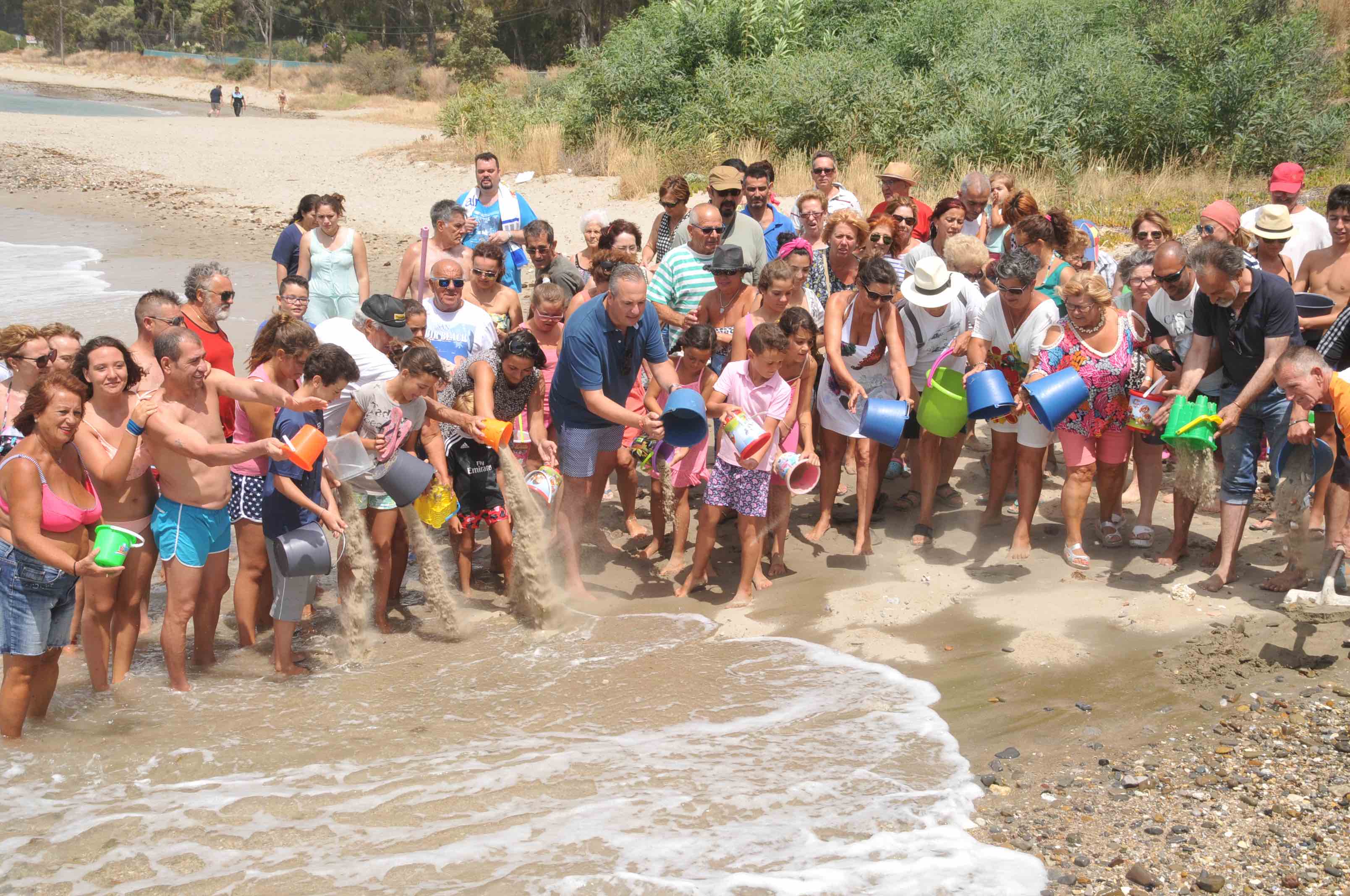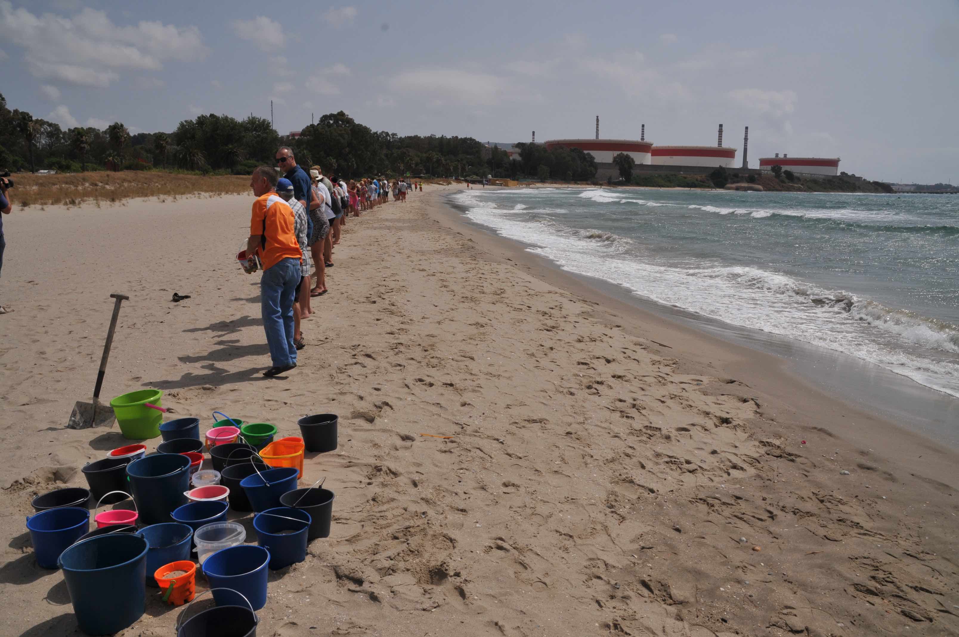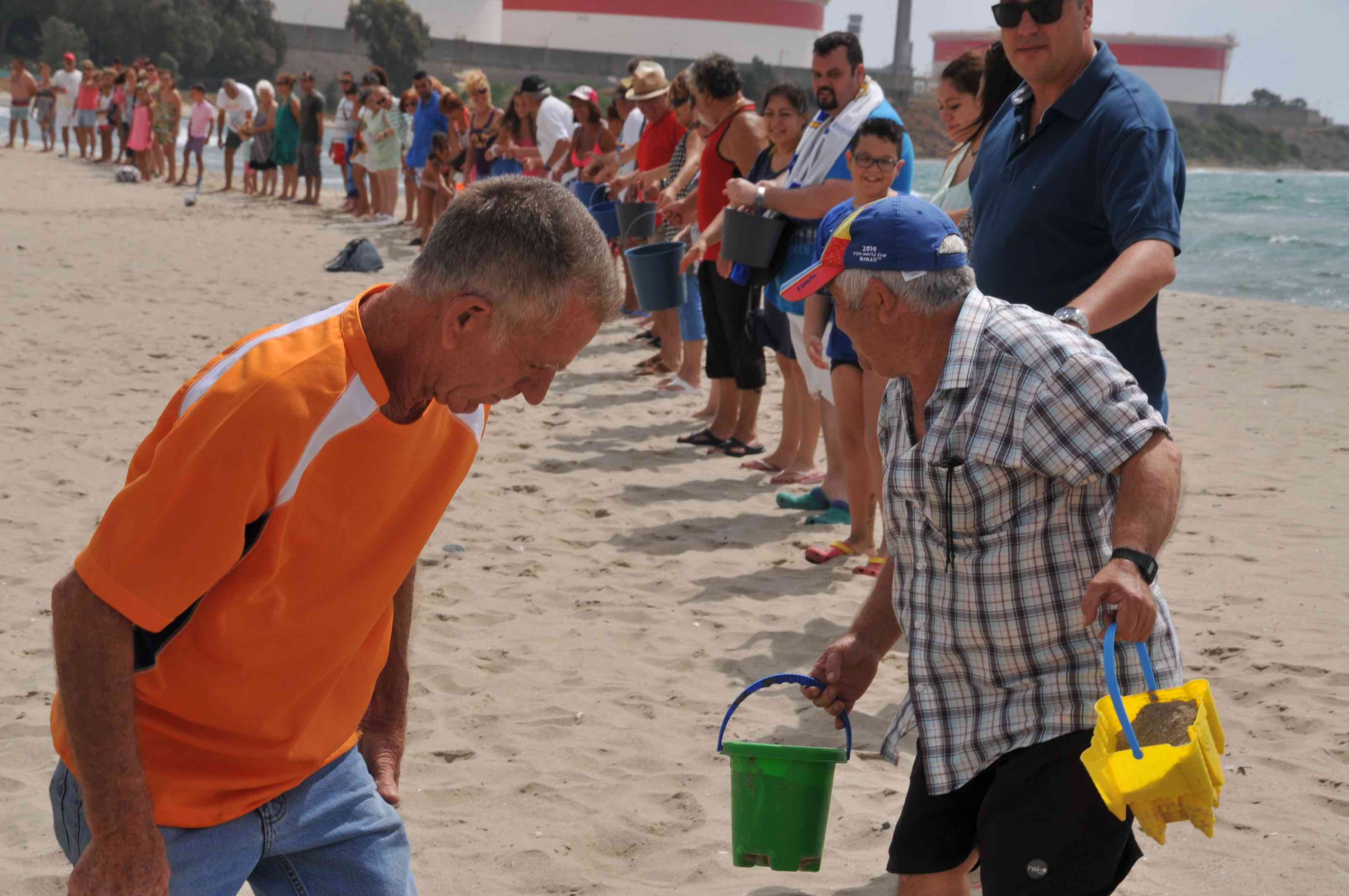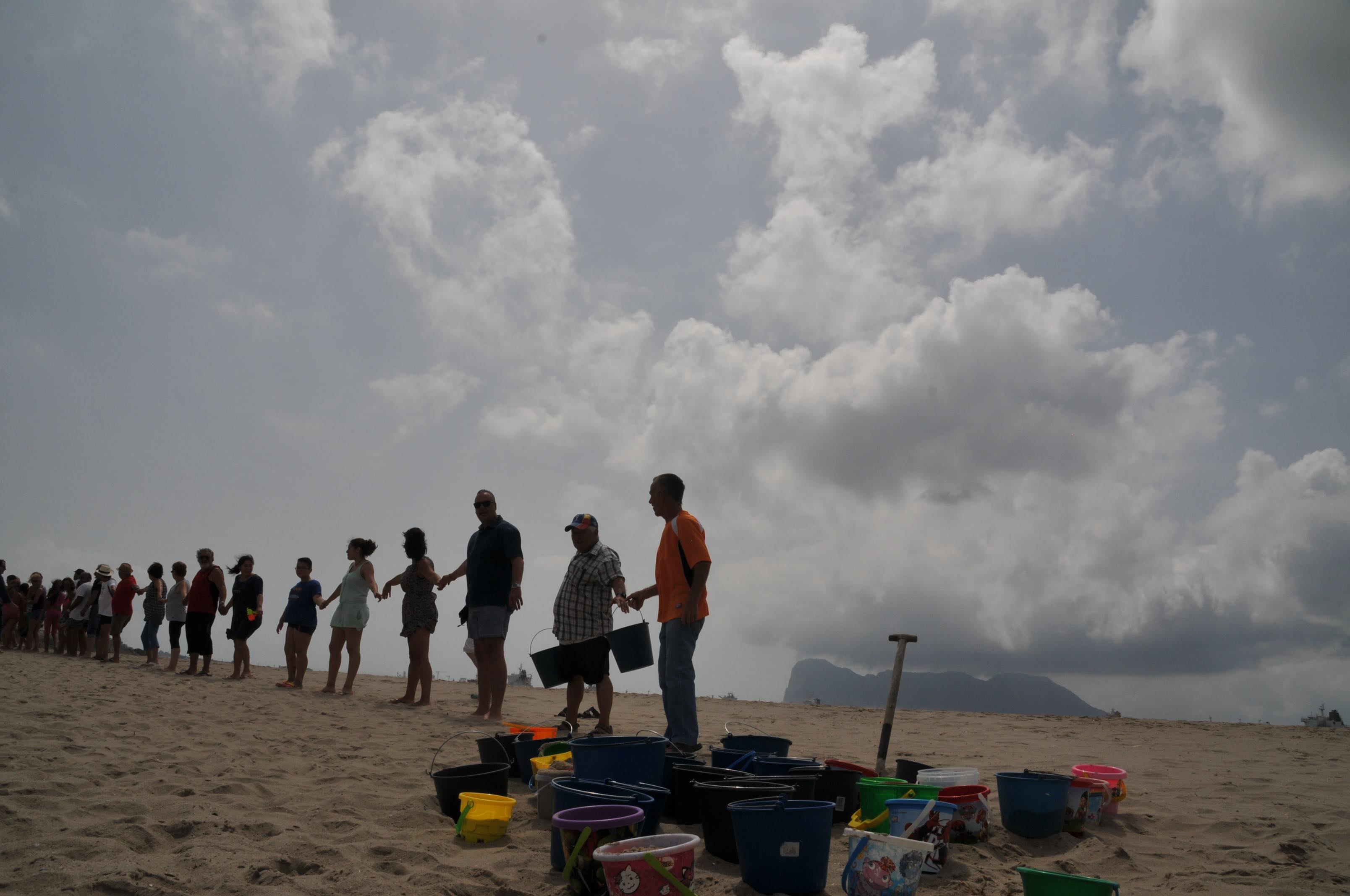 Vecinos de ambas barriadas, concejales del Ayuntamiento y bañistas que estaban en la playa han formado una cadena humana para trasladar en cubos de playa infantiles arena desde la desembocadura del rio Guadarranque hasta el fortín existente en el otro extremo de la playa.