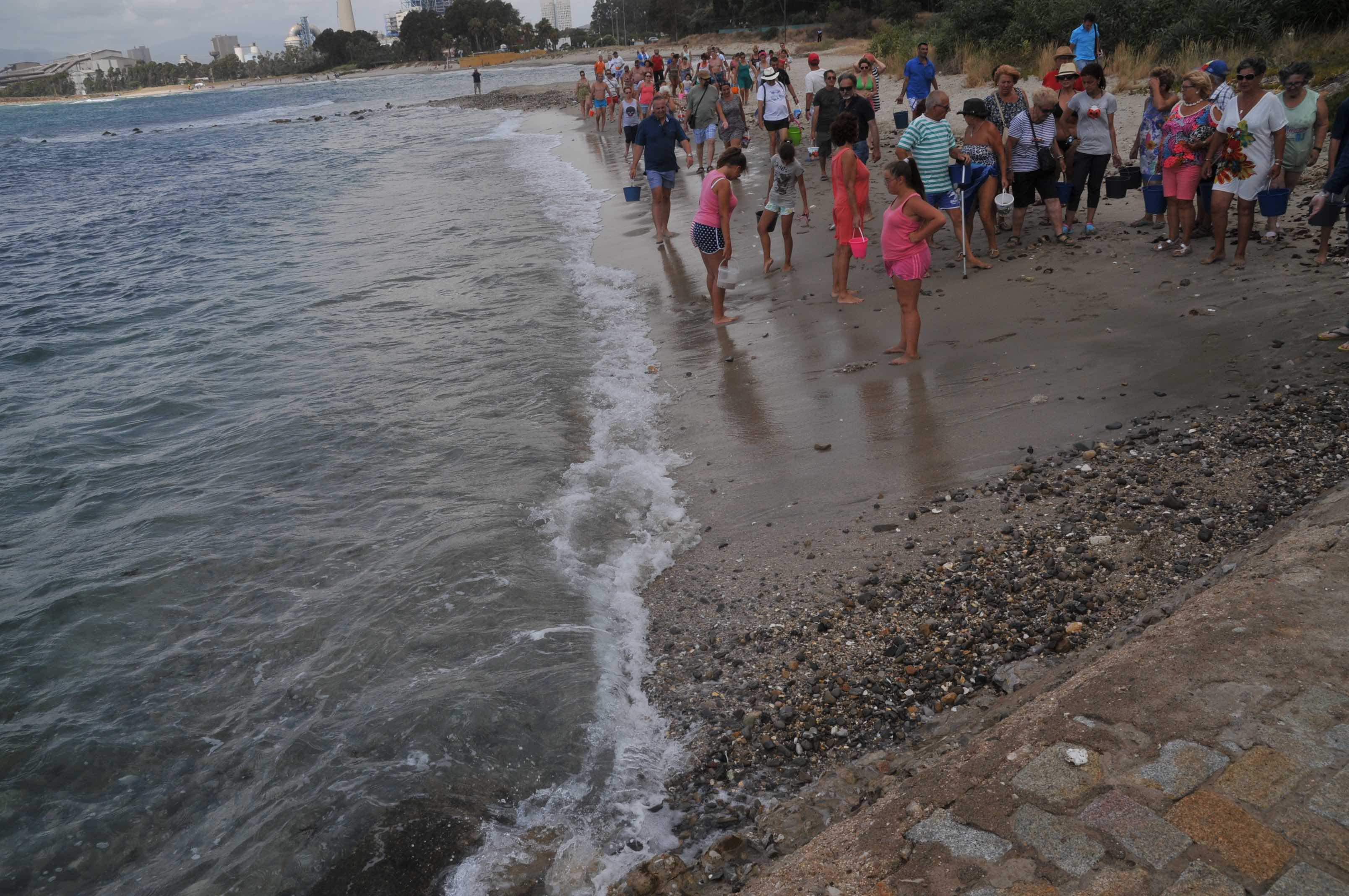 Varios ediles del Ayuntamiento, con el alcalde, Juan Carlos Ruiz Boix, a la cabeza, han participado en este acto simbólico, desarrollado desde las 12 del mediodía, y que se han ido sumando bañistas que, pese al molesto viento de levante, se encontraban hoy en la playa.