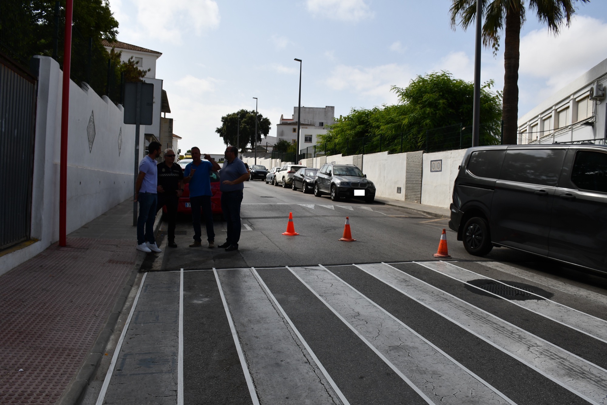 El alcalde accidental, Óscar Ledesma, junto al teniente de alcalde de Seguridad Ciudadana y Tráfico, David Ramos, y a técnicos municipales de Emadesa y la empresa que va a llevar a cabo estos trabajos, han realizado una visita a uno de los puntos en los que se va a actuar sobre los pasos de cebra.