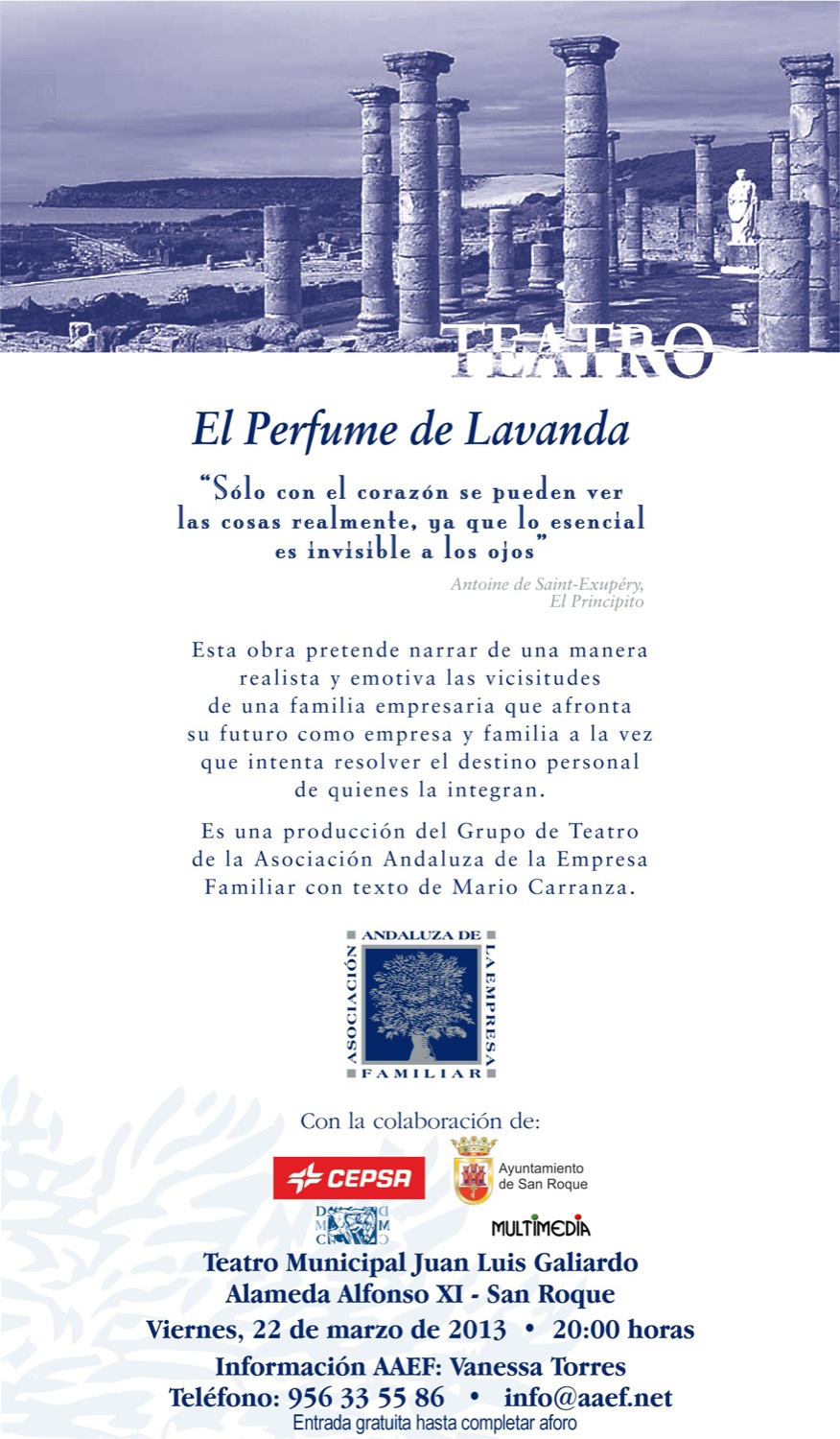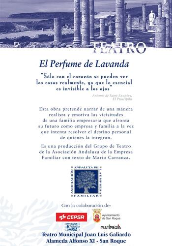 El Grupo de Teatro de la Asociación Andaluza de la Empresa Familiar representará el próximo viernes en el Teatro Juan Luis Galiardo la obra “El perfume de lavanda”, que podrá disfrutarse a partir de las 20.00 horas. La entrada es gratuita hasta completarse el aforo.