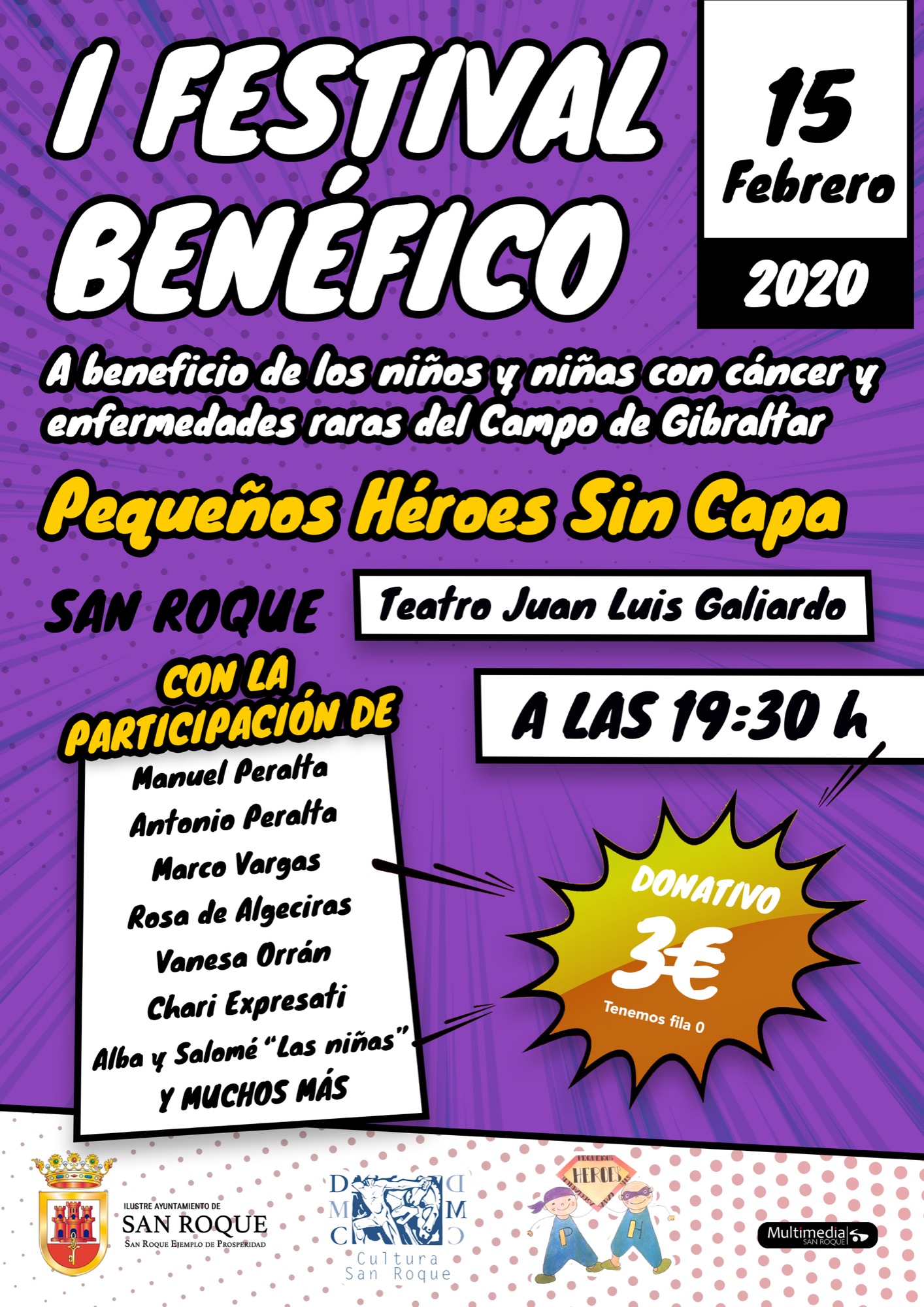 La Asociación “Pequeños héroes sin capa”, organiza el 15 de febrero en el Teatro Juan Luis Galiardo de San Roque, el I Festival Benéfico “Pequeños héroes sin capa”. En el mismo participarán artistas de San Roque y de la comarca. Colaboran la Delegación de Cultura, que dirige Ana Ruiz, y la Empresa Multimedia.