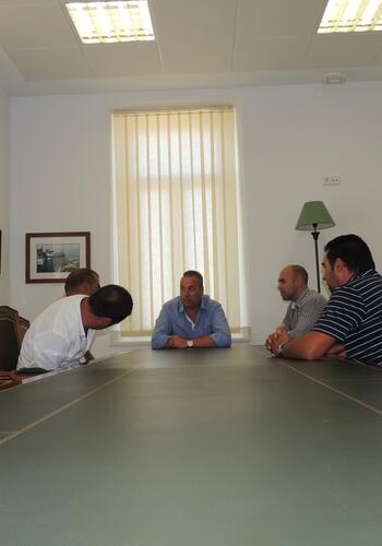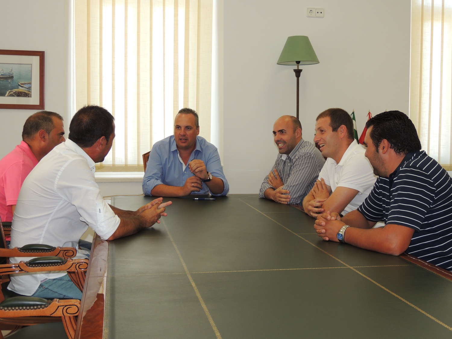 El alcalde de San Roque, Juan Carlos Ruiz Boix, y el tte de alcalde de Deportes, Juan Manuel Ordoñez, han recibido hoy a una representación de los 7 nuevos entrenadores de fútbol que tienen categoría nacional en el municipio.