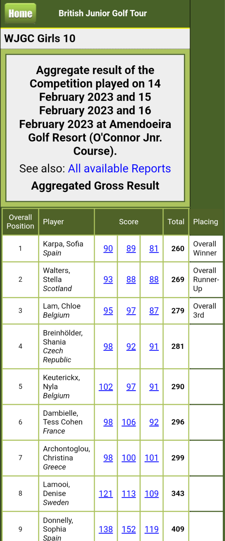 Con vueltas de 90-89-82 para un total de 260 golpes, la joven golfista sanroqueña de la categoría Sub 10 se impuso con solvencia a la escocesa Estella Walters, y a la belga Chloe Lam.