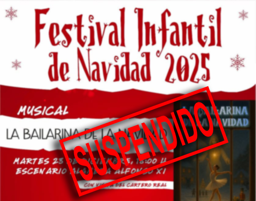 El musical “La bailarina de la Navidad”, previsto para este martes 23 de diciembre en el escenario de la Alameda a partir de las 18:00 horas, se ha suspendido debido a la previsión de lluvias para la tarde de esta jornada, al igual que la visita del Cartero Real también prevista para este martes. Ante la imposibilidad de montar los equipos, entre ellos electrónicos, debido a la peligrosidad por la caída de agua y para preservar la seguridad de los asistentes, los responsable municipales han decidido cancelar la actividad.