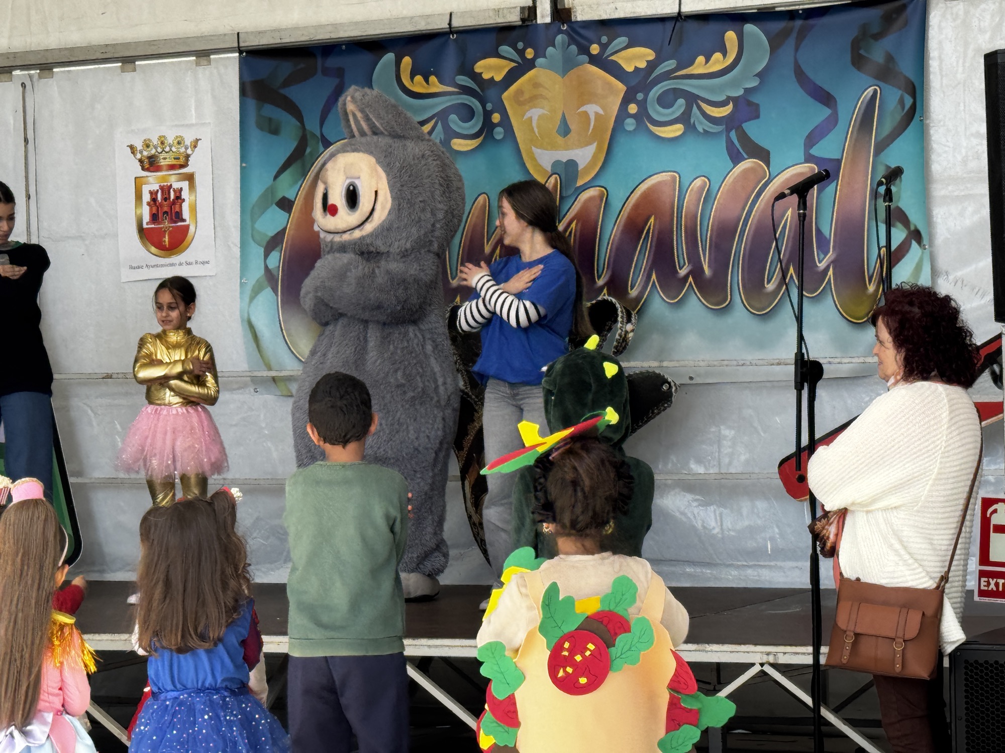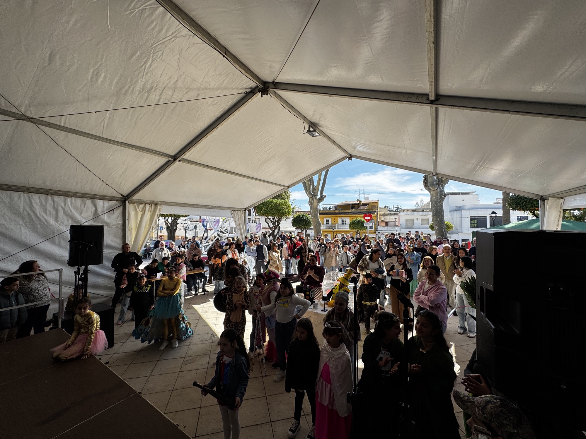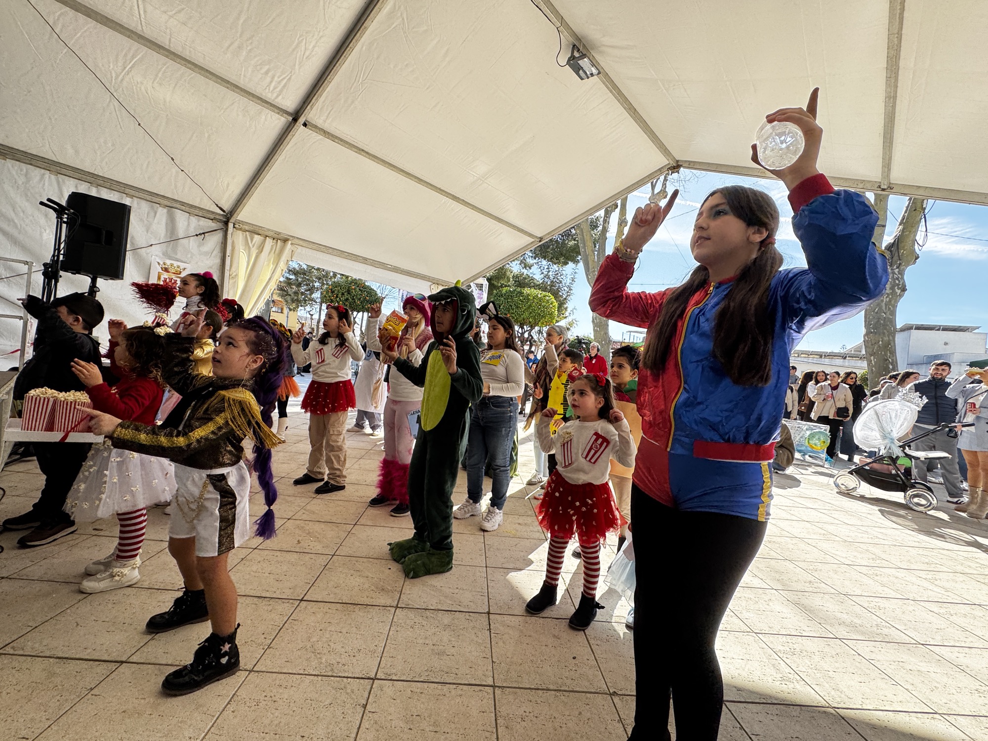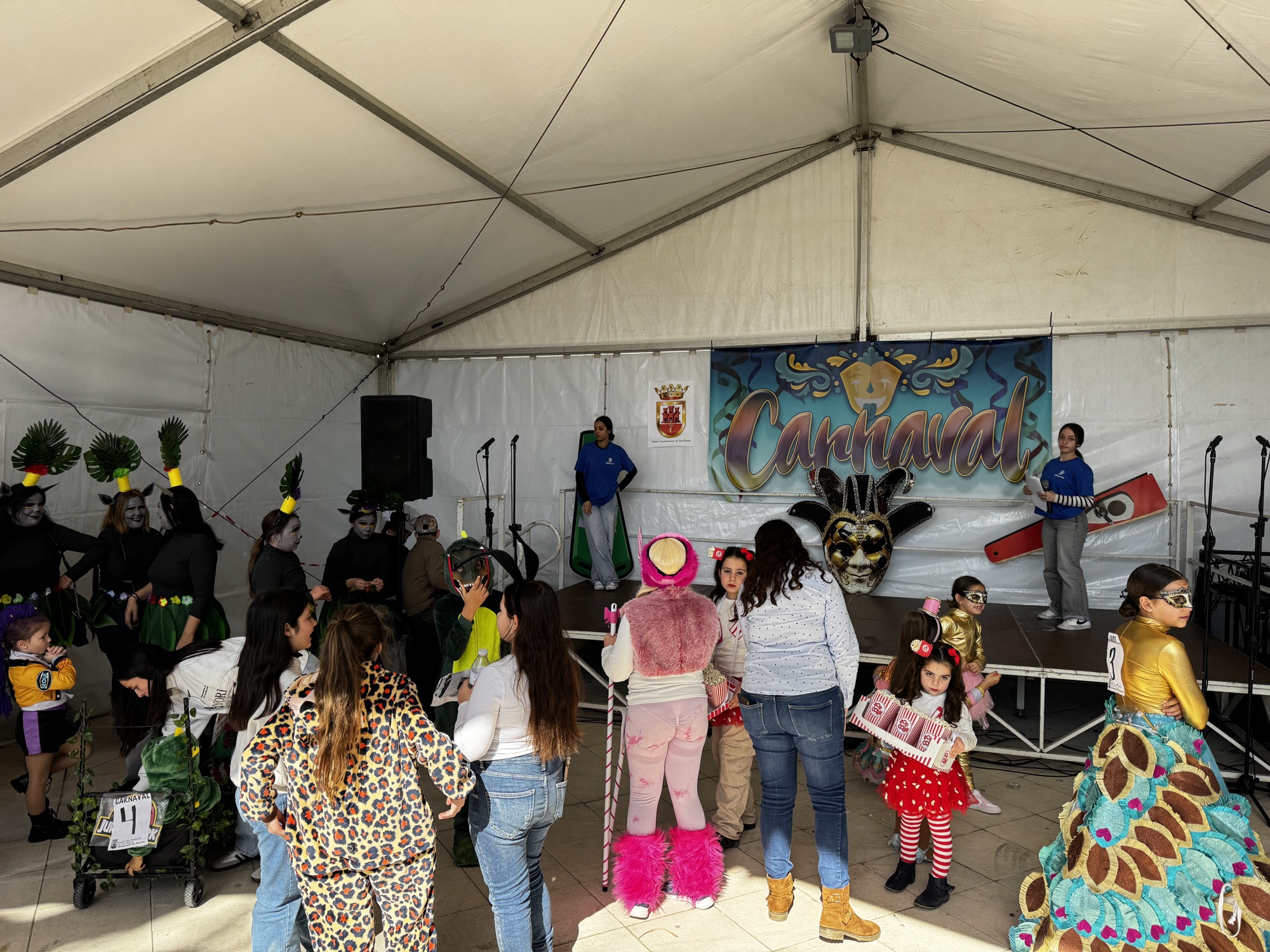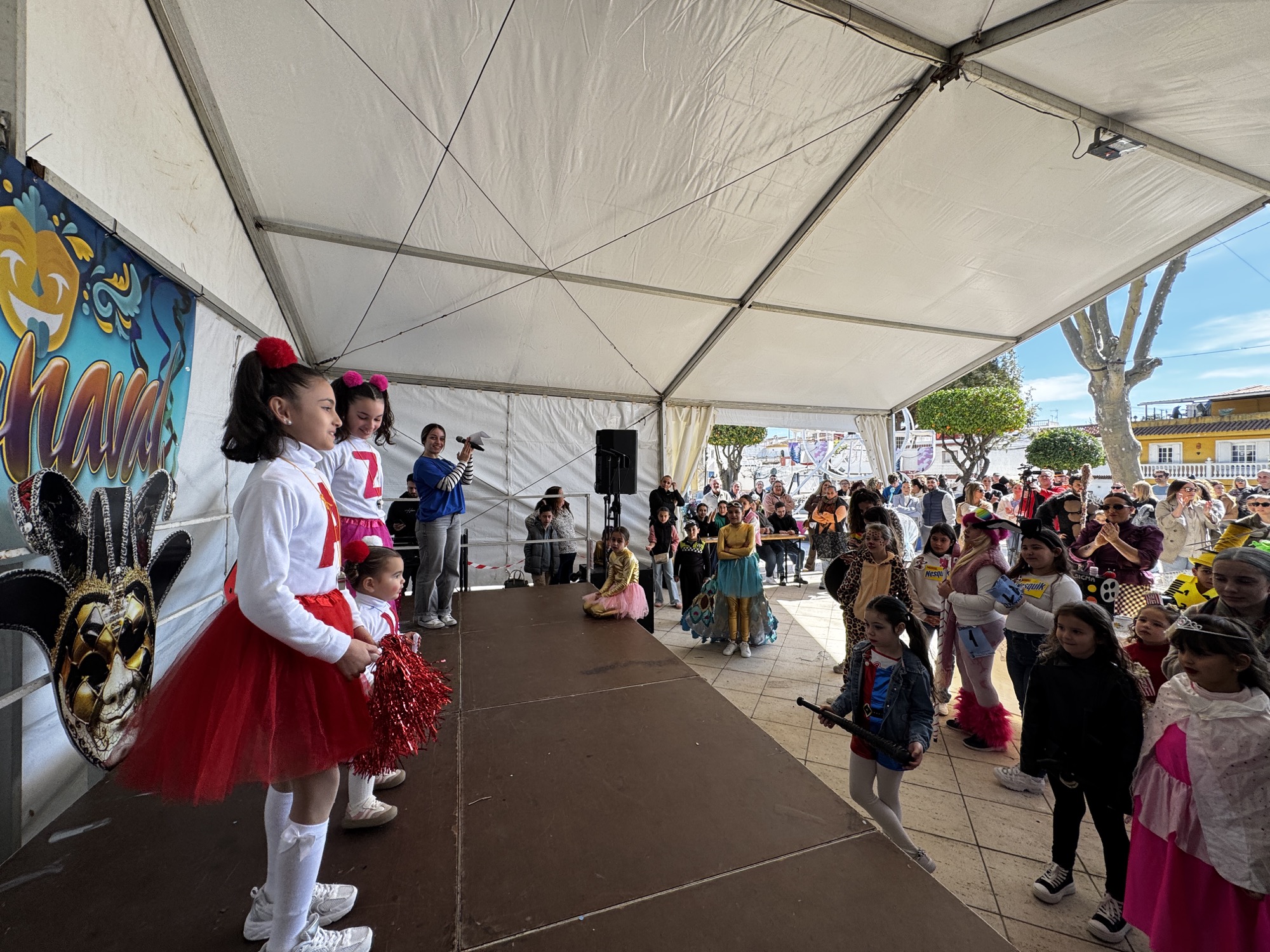 A mediodía comenzó la inscripción del concurso de disfraces infantil, con un grupo de animación posterior. A las 13.30 horas actuó la agrupación carnavalesca “Sin novedad en el frente, los hijos de Putin”. Previamente comenzaba el jurado a deliberar con la presencia de los concursantes infantiles.