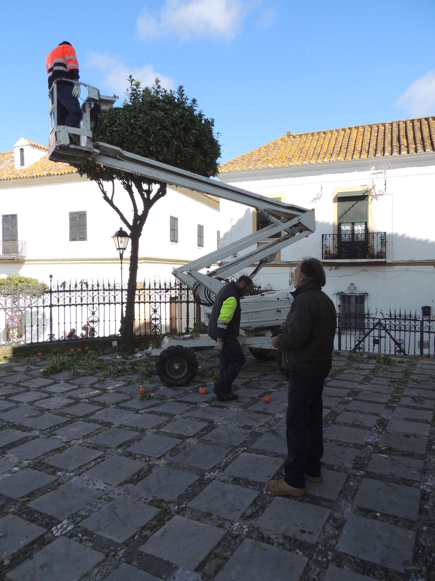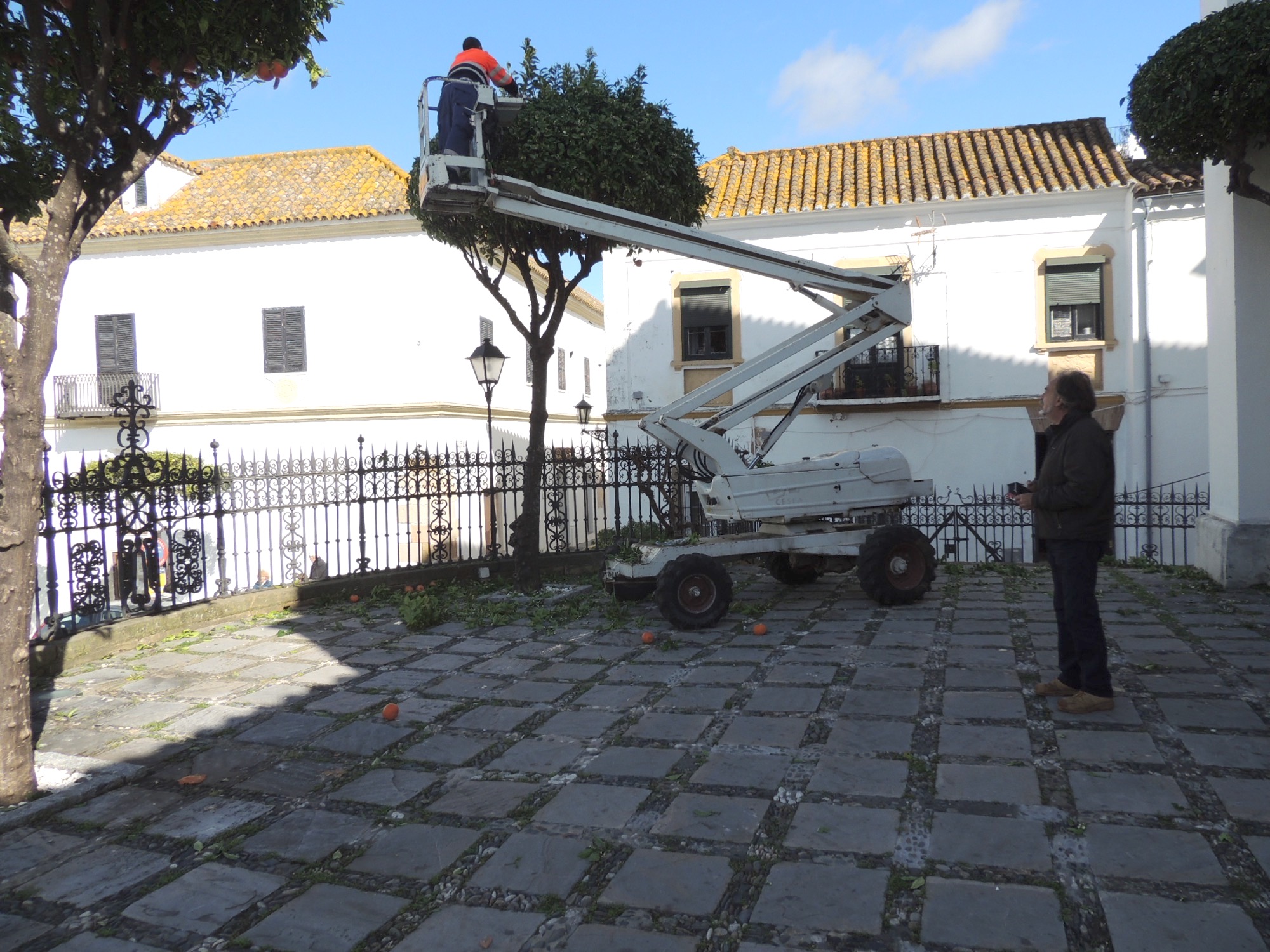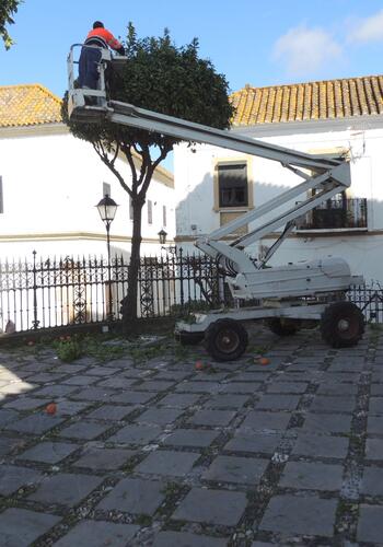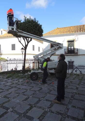 Así, en al jornada de ayer, los operarios de esta delegación procedieron a la poda de los naranjos existentes en el atrio de la parroquia Santa María Coronada, no ya sólo para su lucimiento, sino también para que no estorben a los pasos.