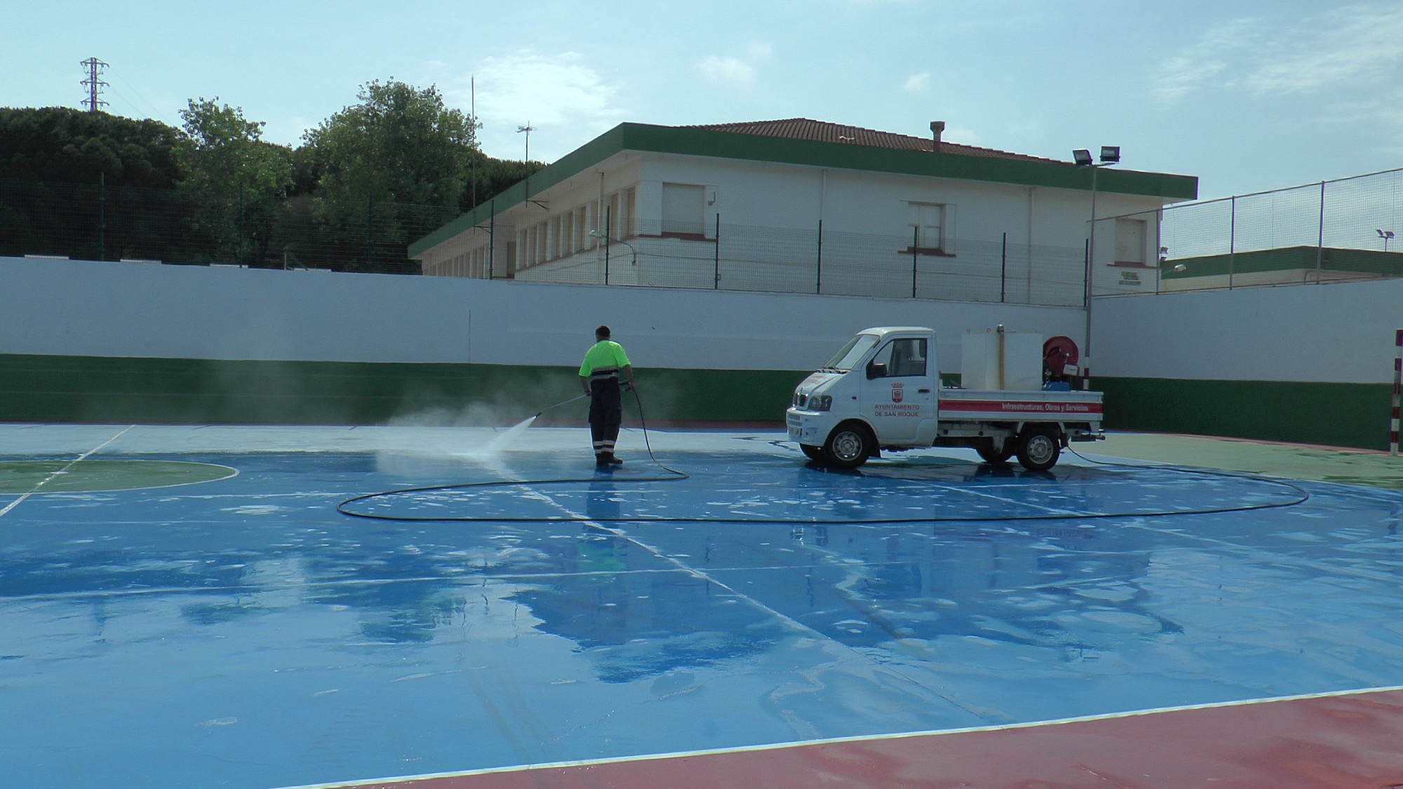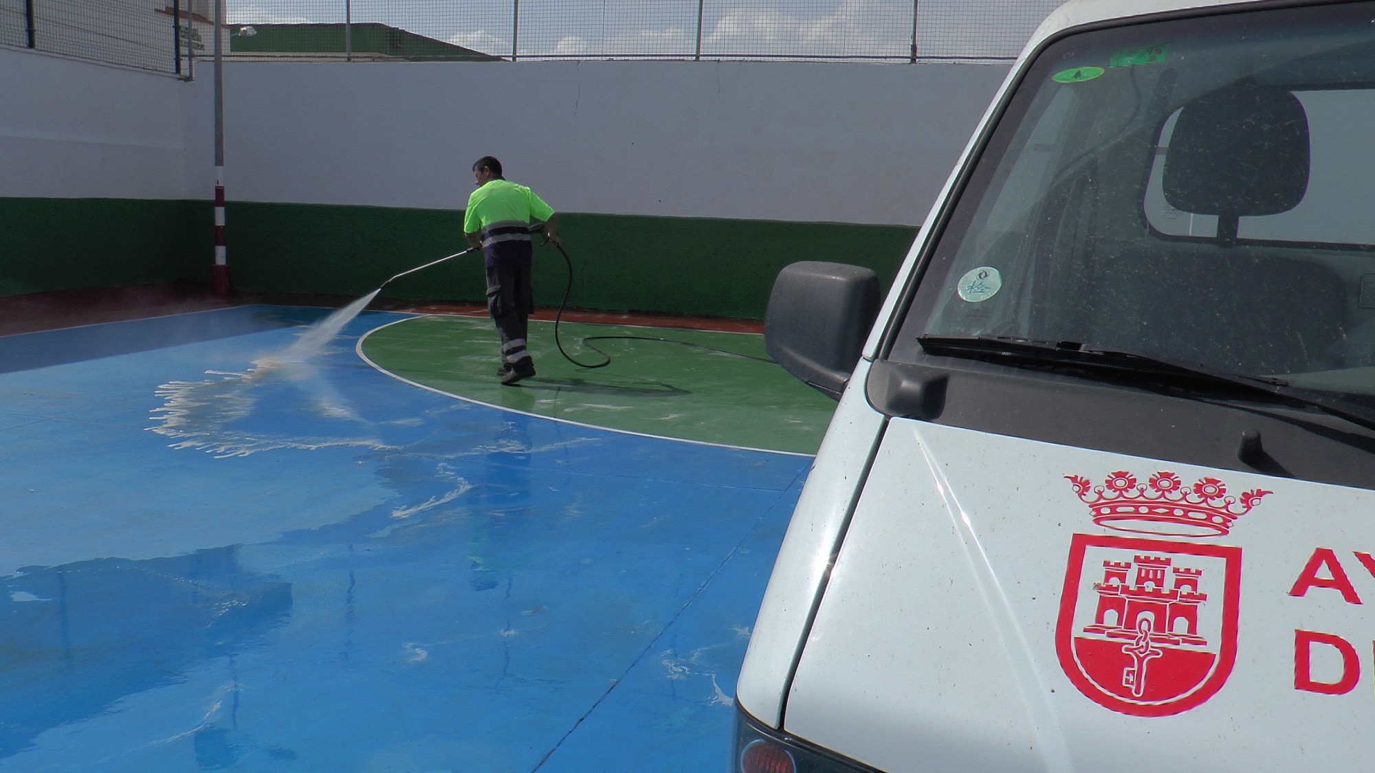 En la barriada de Taraguilla, se ha realizado una limpieza a fondo de las pistas deportivas, junto al CEIP María Reboloso, donde se ha empleado mangueras con agua caliente a presión.