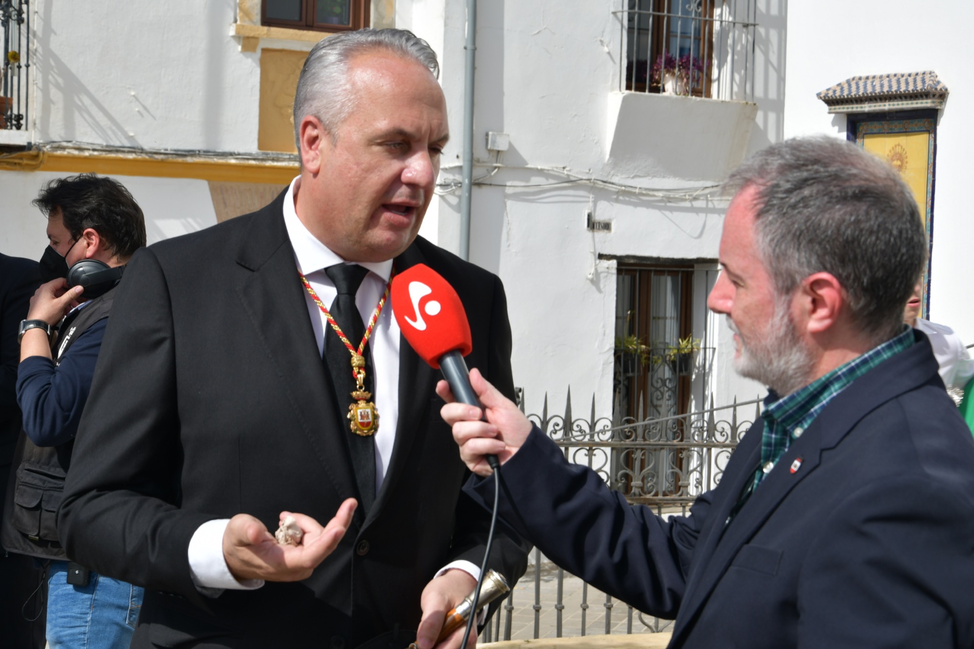 El primer edil destacó que, afortunadamente, reinaba el buen tiempo, de manera que se iba a poder disfrutar de la Procesión Magna después de tres años de interrupción (en 2019 se suspendió por lluvia, y los dos años siguientes por pandemia). Tuvo palabras para el personal de Multimedia, a quienes también saludó en el Palacio, por la gran labor que están realizando durante toda la Semana Santa.