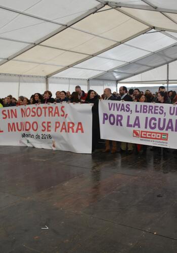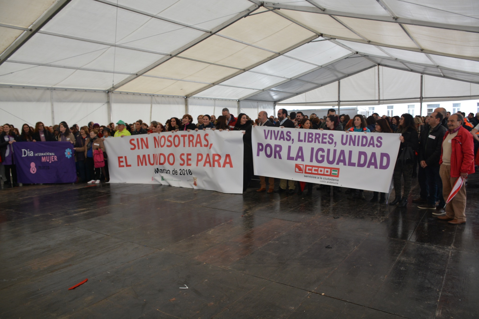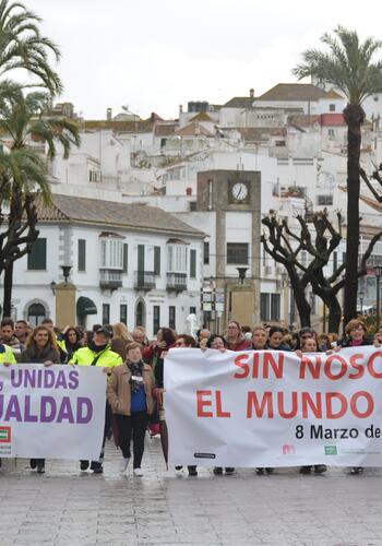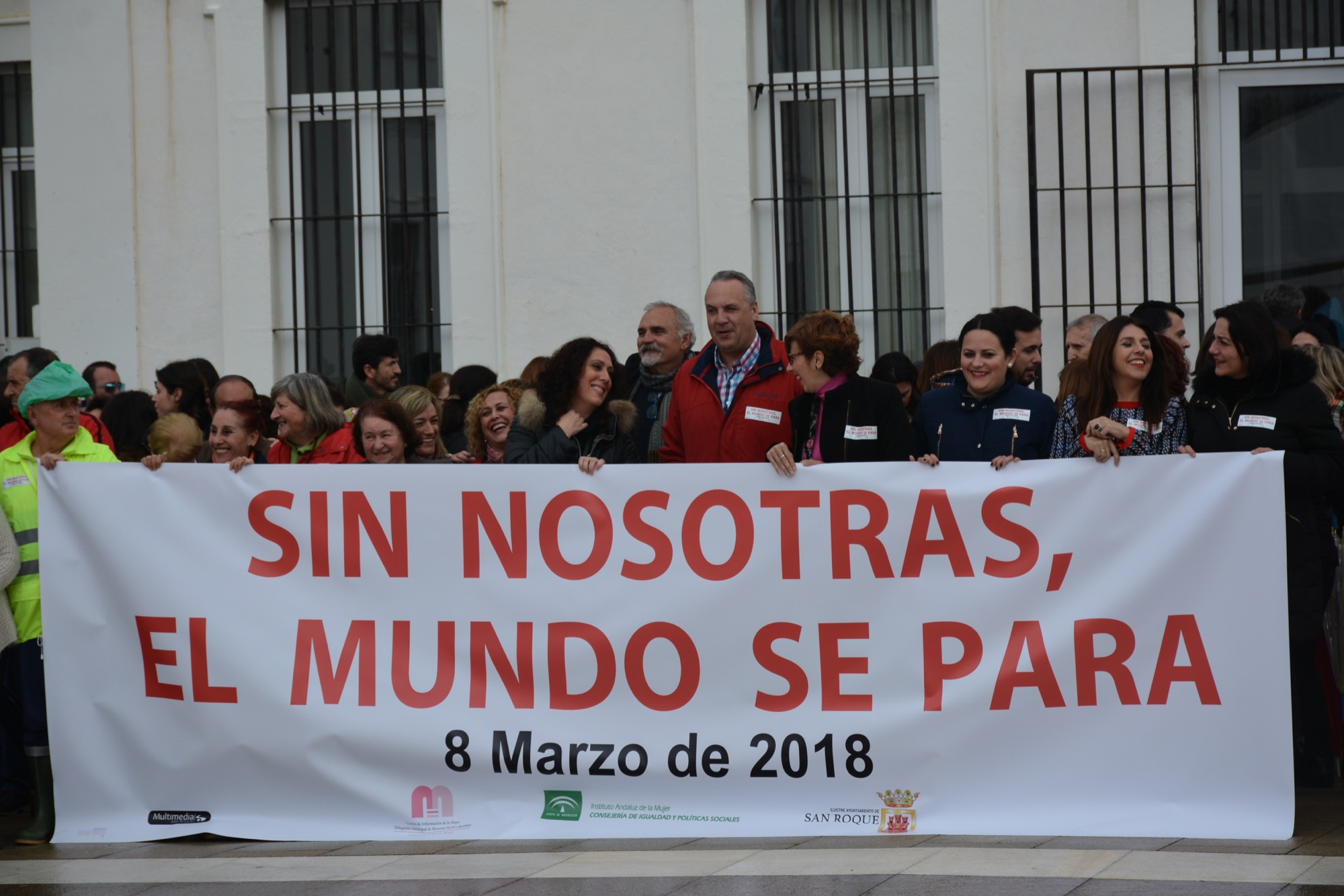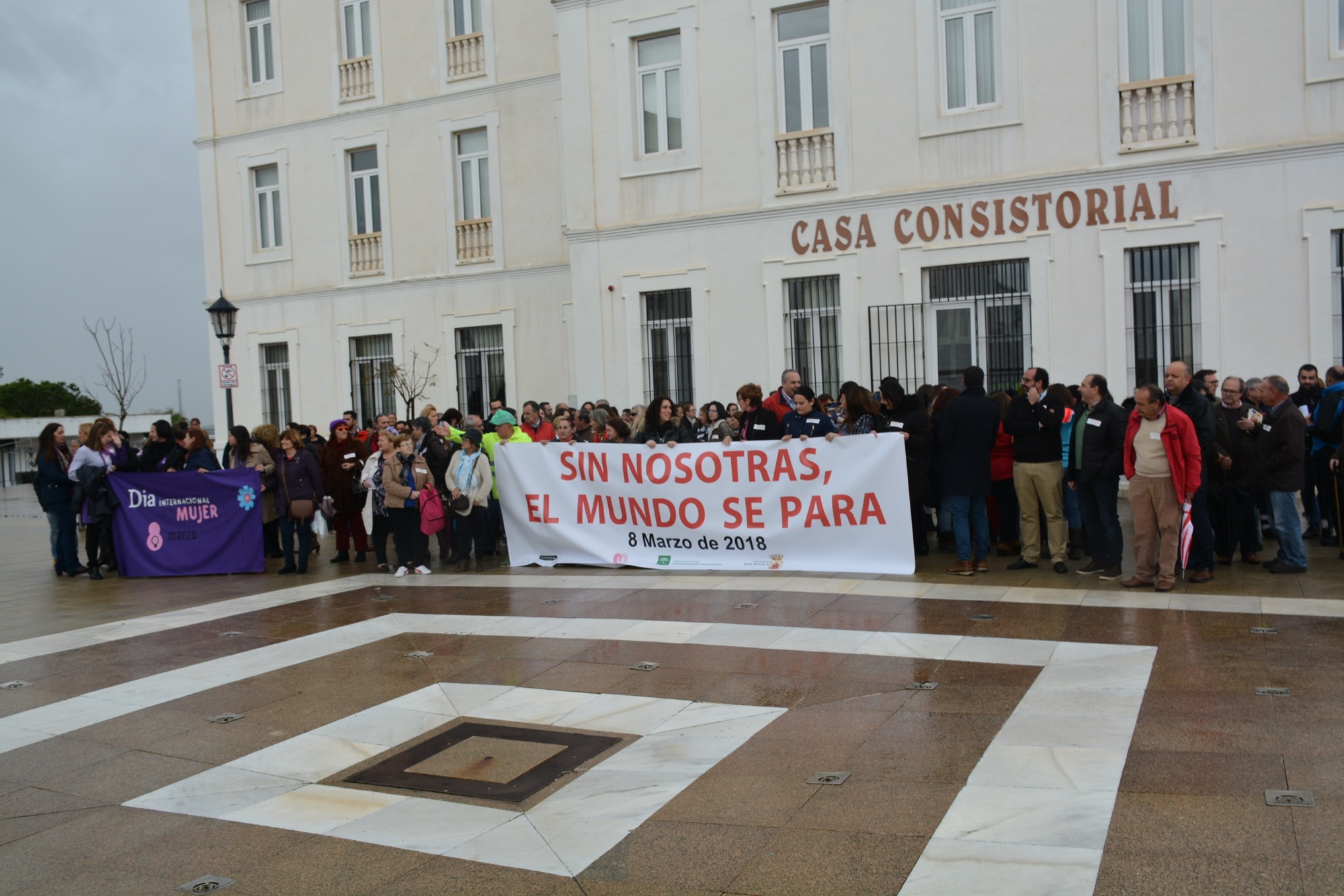 Encabezaban la manifestación las concejalas del Equipo de Gobierno y representantes de colectivos de mujeres, mientras que el alcalde, Juan Carlos Ruiz Boix, y los ediles varones se situaron en segundo plano. La protesta se inició frente a la Casa Consistorial, aunque se desplazó por lluvia al interior de la carpa que se estaba desmontando en la Plaza de las Constituciones, para luego seguir en la Alameda Alfonso XI. En la pancarta principal se leía: “Sin nosotras, el mundo se para”, lema que fue coreado por los asistentes.