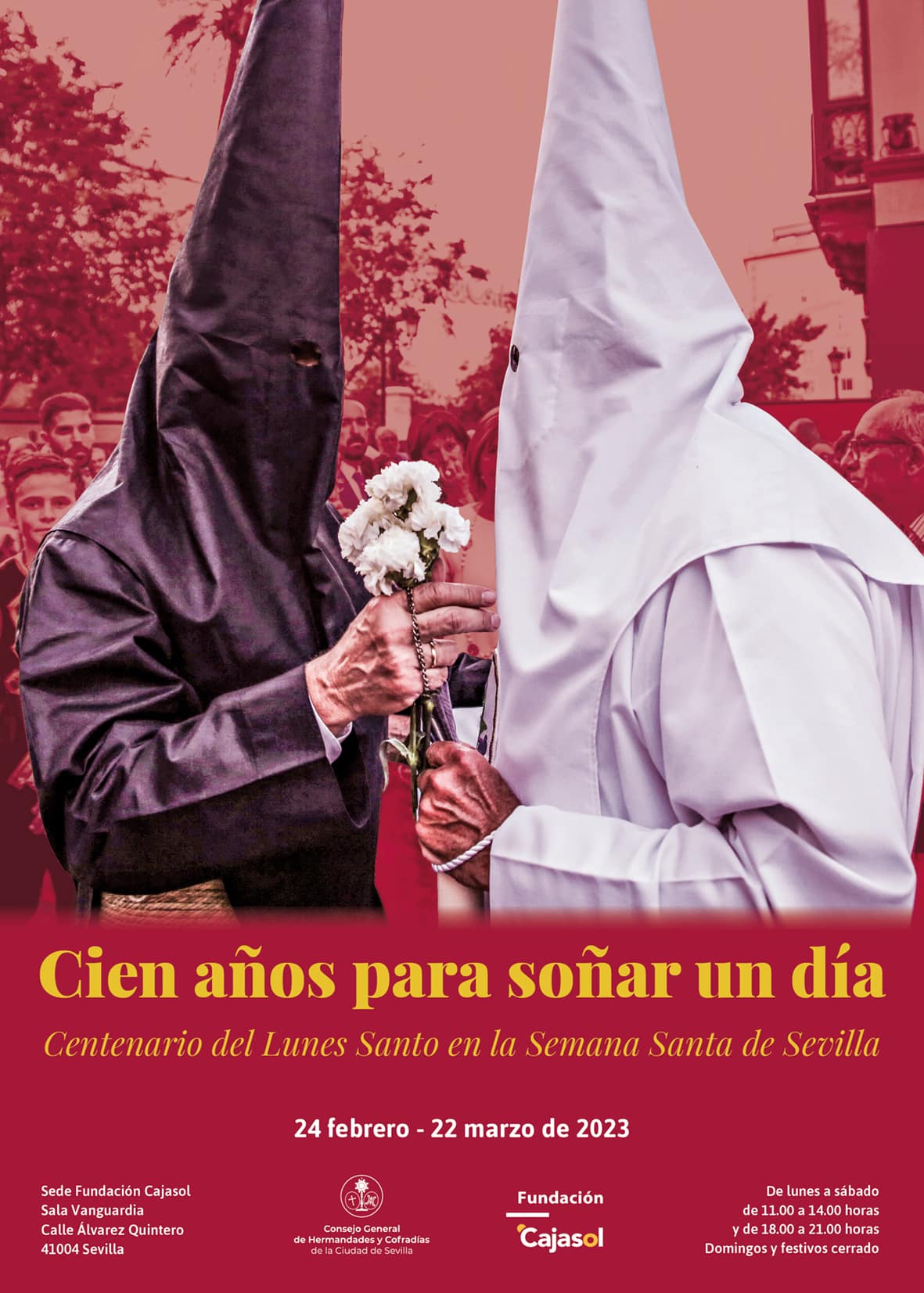 La sede de la Fundación Cajasol de Sevilla, en la calle Álvarez Quintero, acoge estos días la exposición titulada “Cien años para soñar un día, Centenario del Lunes Santo en la Semana Santa de Sevilla”. La muestra, que se ubica en la Sala Vanguardia, está dedicada a la génesis y evolución de dicha jornada religiosa, y en ella se exponen enseres, documentos y diversas imágenes. Se trata de piezas que ya no salen a la calle o que son modelos intermedios.