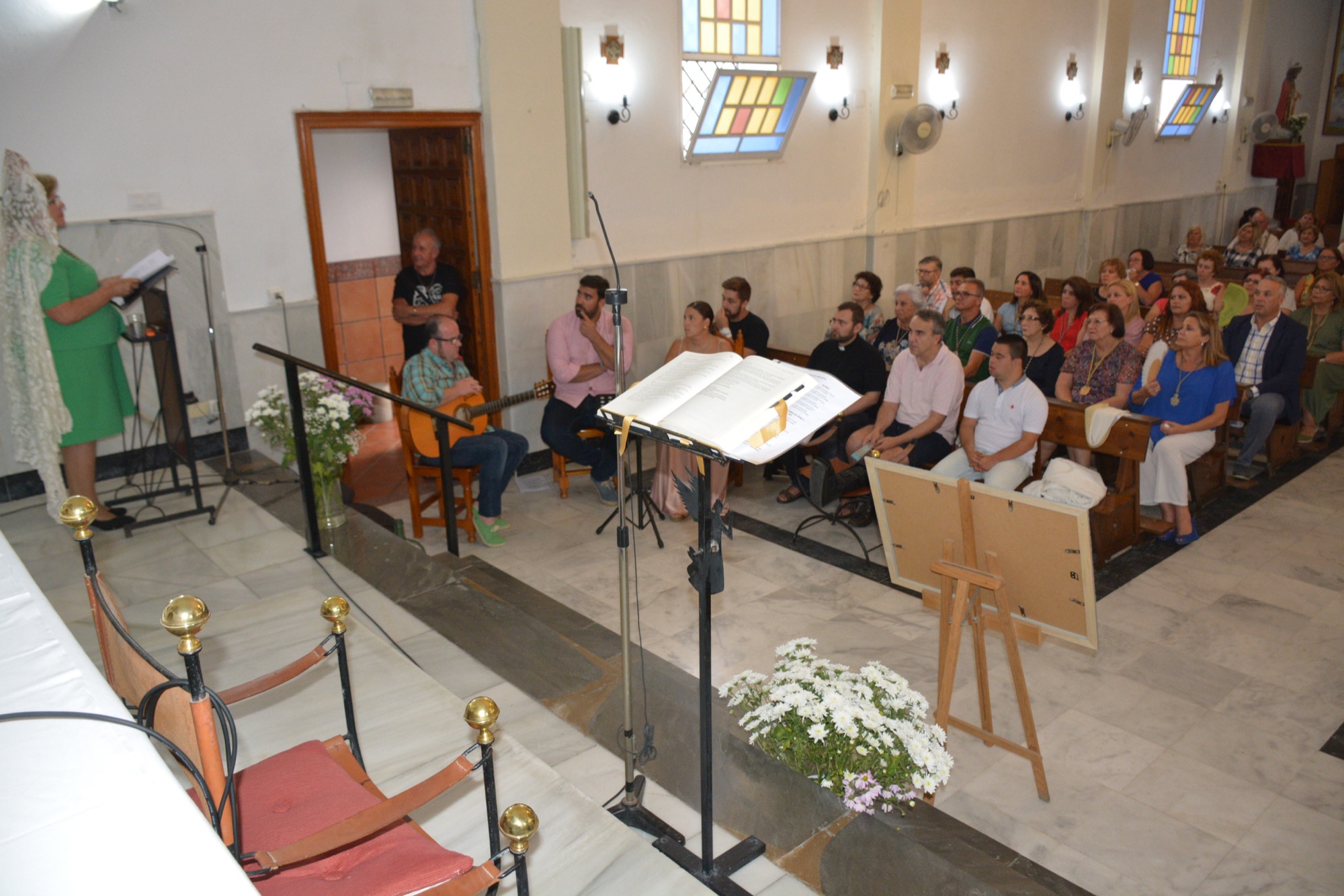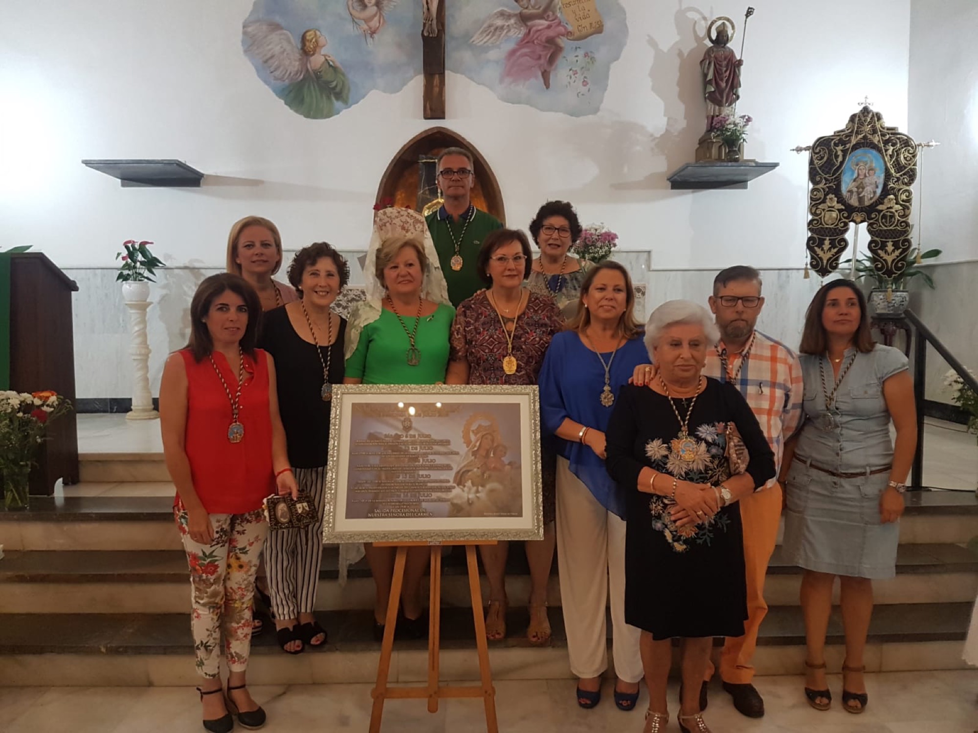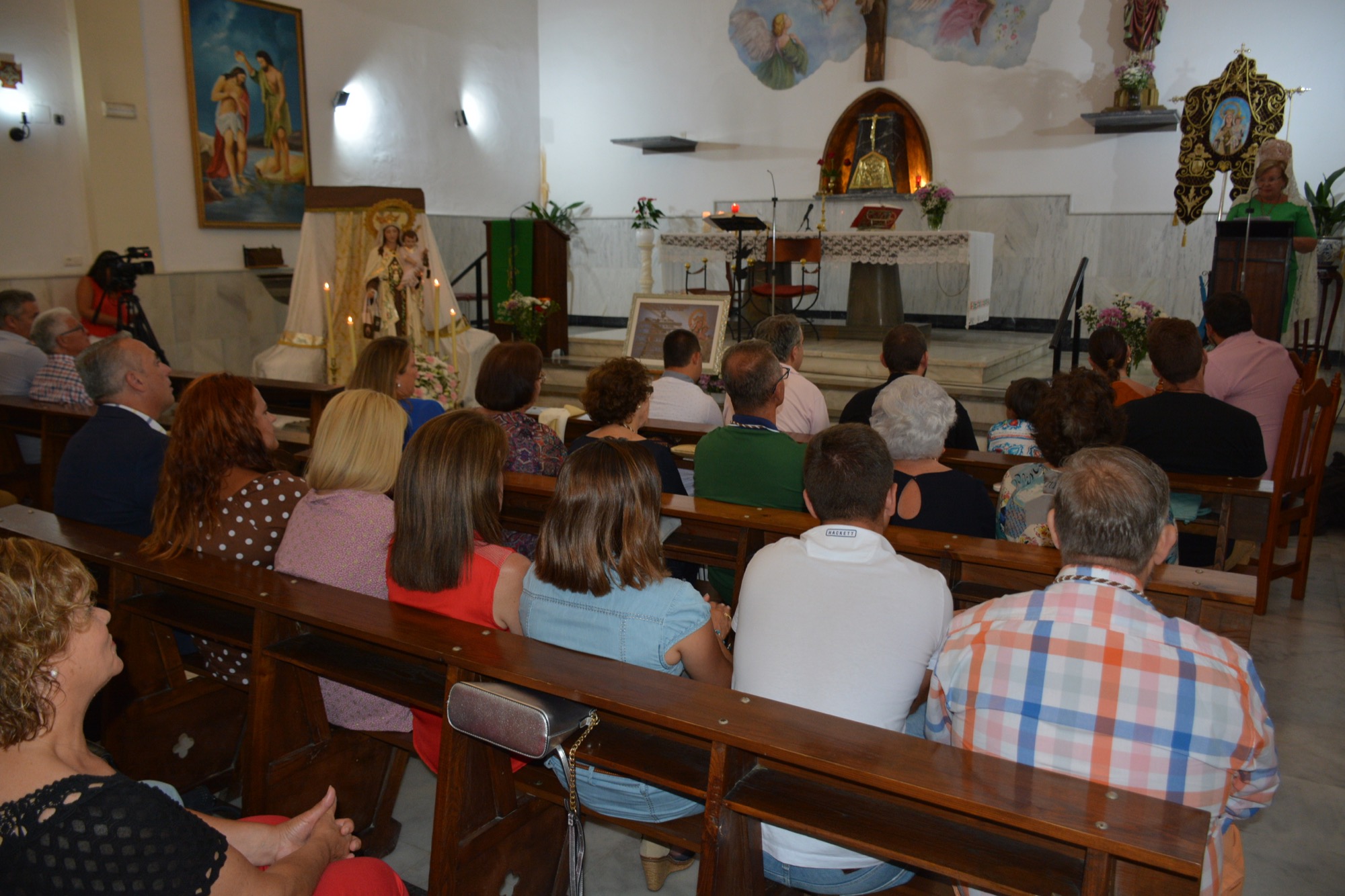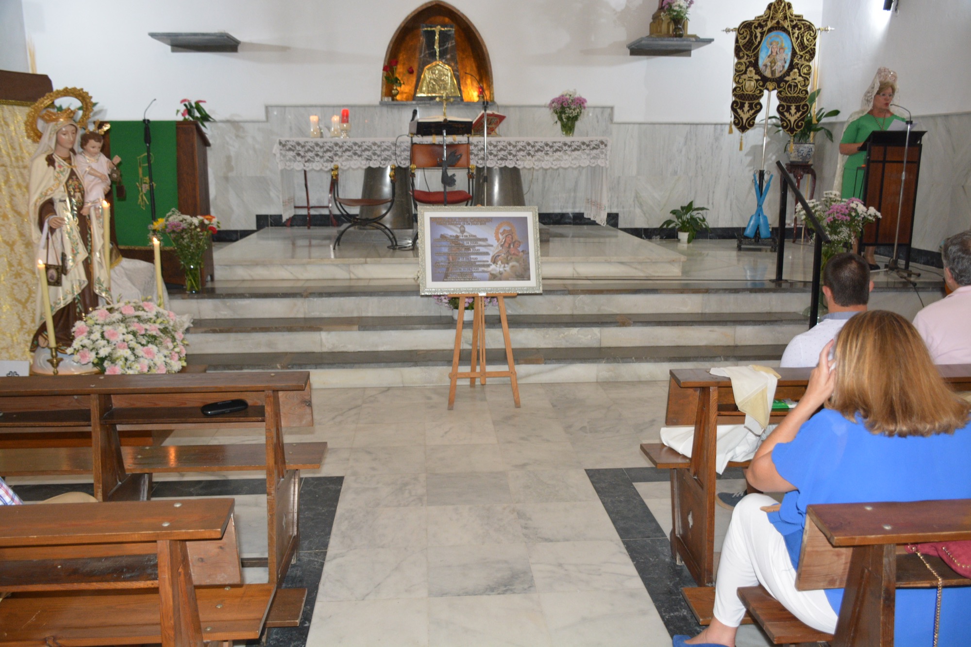 Junto a numerosos fieles, asistieron al pregón varias autoridades municipales, entre las que se contaron el alcalde, Juan Carlos Ruiz Boix, y la teniente de alcalde de la Zona de Bahía, Mónica Córdoba, así como una representación del Consejo Local de Hermandades y Cofradías. El acto comenzó con el descubrimiento del cartel, que llevaron a cabo la Hermana Mayor de la Cofradía de la Virgen del Carmen, María del Carmen Peinado, y David Recaño, que es costalero de la Virgen y monaguillo de la parroquia.