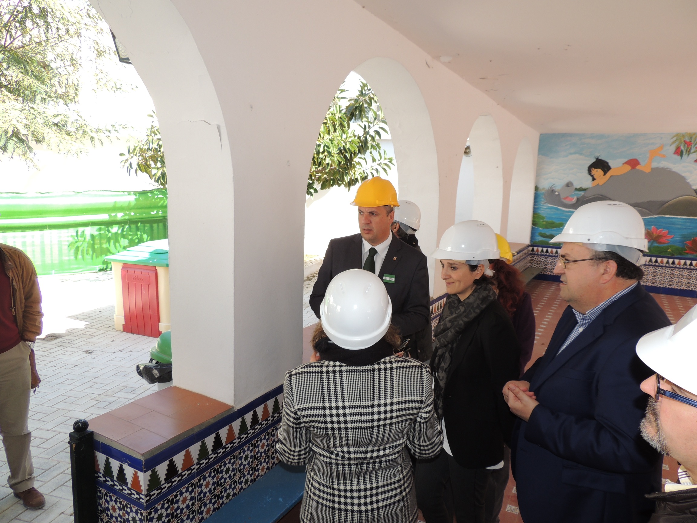 El alcalde de San Roque, Juan Carlos Ruiz Boix, y la delegada territorial de la Consejería de Educación, Cultura y Deporte, Cristina Saucedo, han visitado esta mañana las obras que la mencionada Consejería, a través de ISE Andalucía y en el marco del Plan OLA, está llevando a cabo el la Escuela Infantil (E.I.) Reina Juana de San Roque.