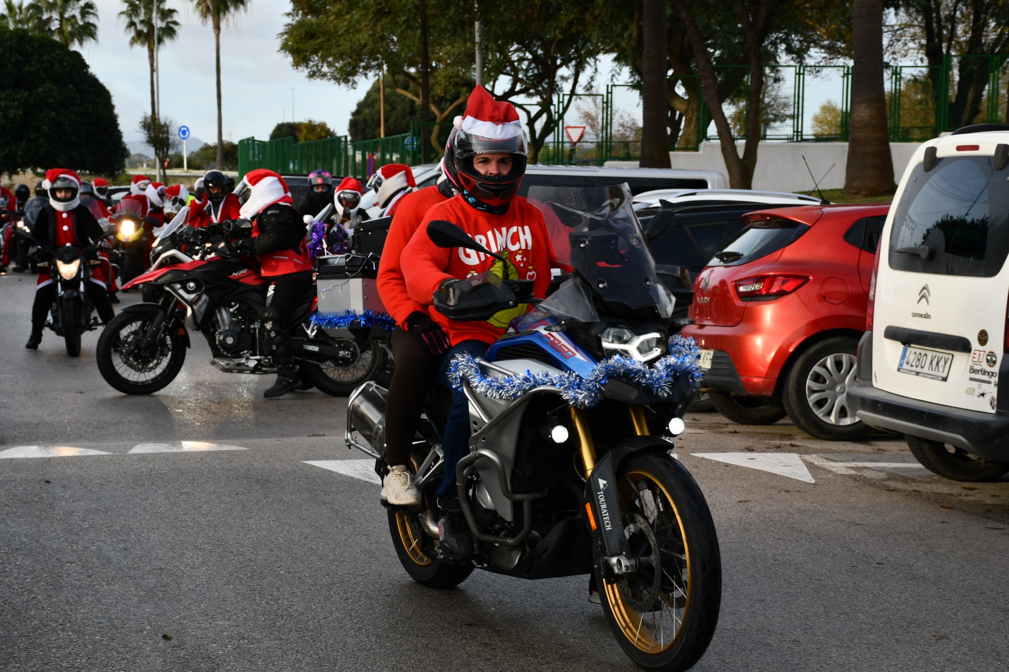 Cerca de un centenar de motoristas del Grupo Motero Campo de Gibraltar han recorrido las calles y carreteras del municipio de San Roque ataviados como Papa Noel y con sus motos adornadas con motivos navideños. La “Papanoelada”, como se ha denominado el encuentro de esta mañana, tiene como objetivo hacer visible y ayudar a la campaña de recogida de juguetes que cada año realiza la asociación Apoyo Mutuo.