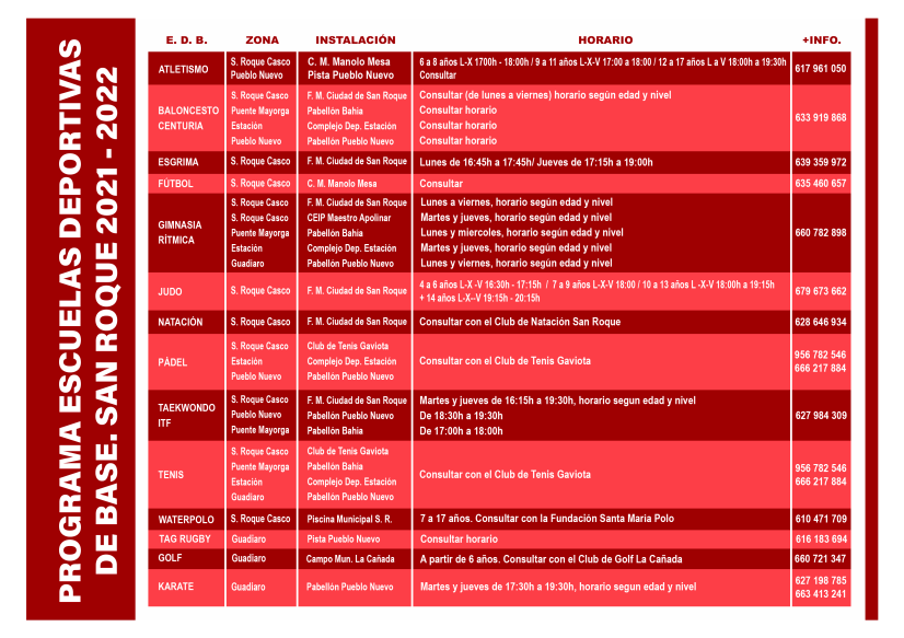 La Delegación Municipal de Deportes, ofertará Escuelas Deportivas de Base en las siguientes modalidades: