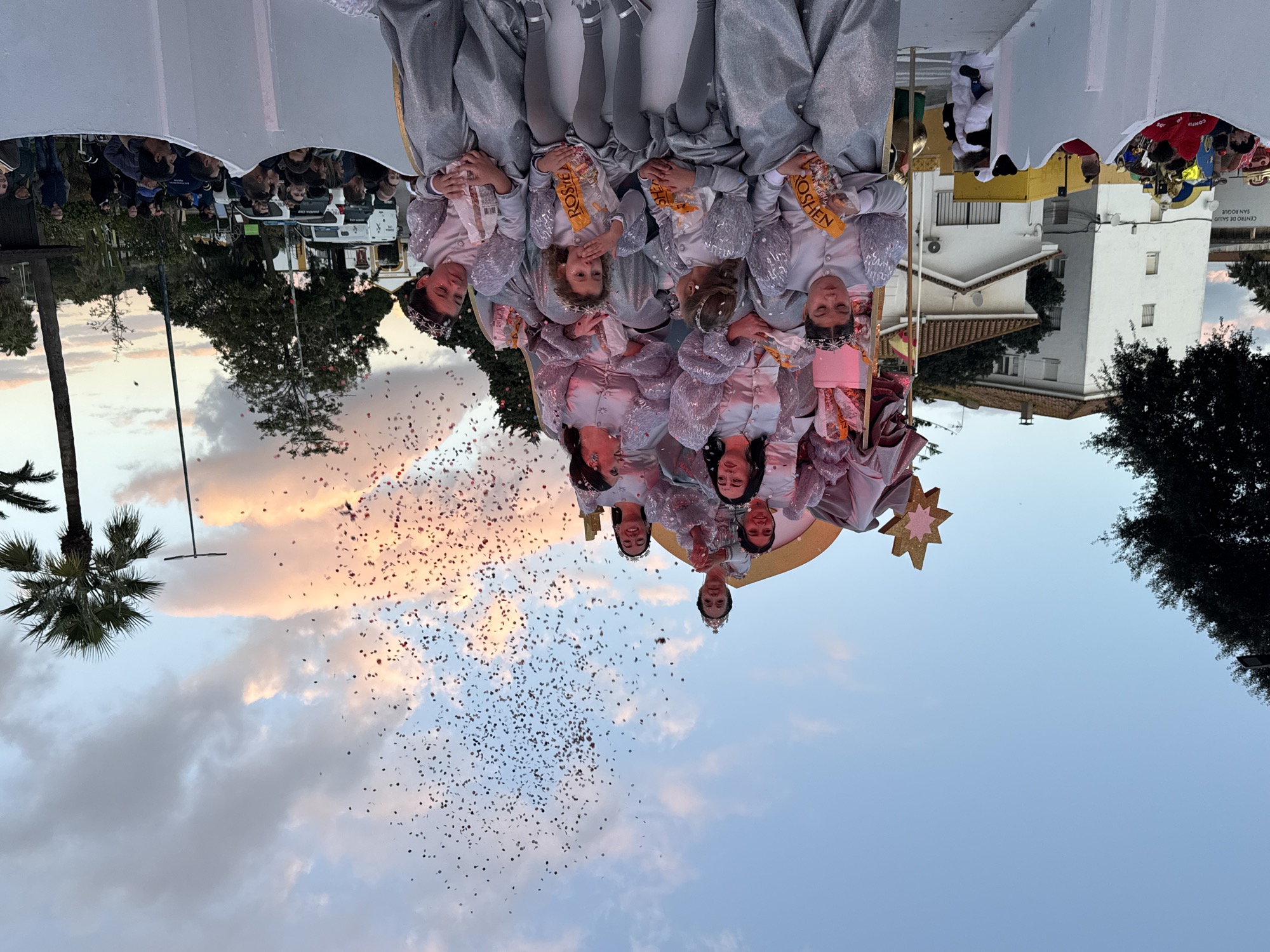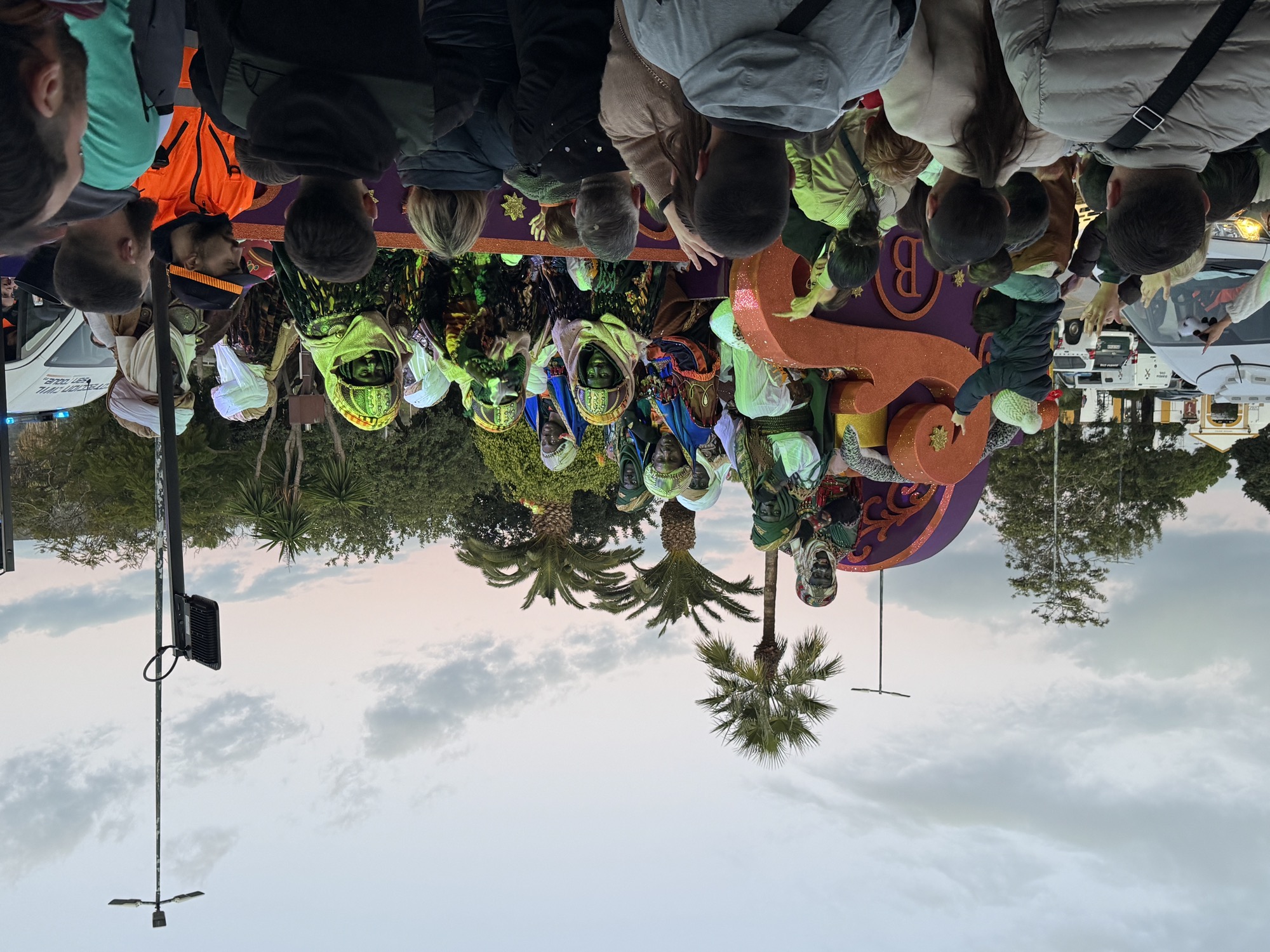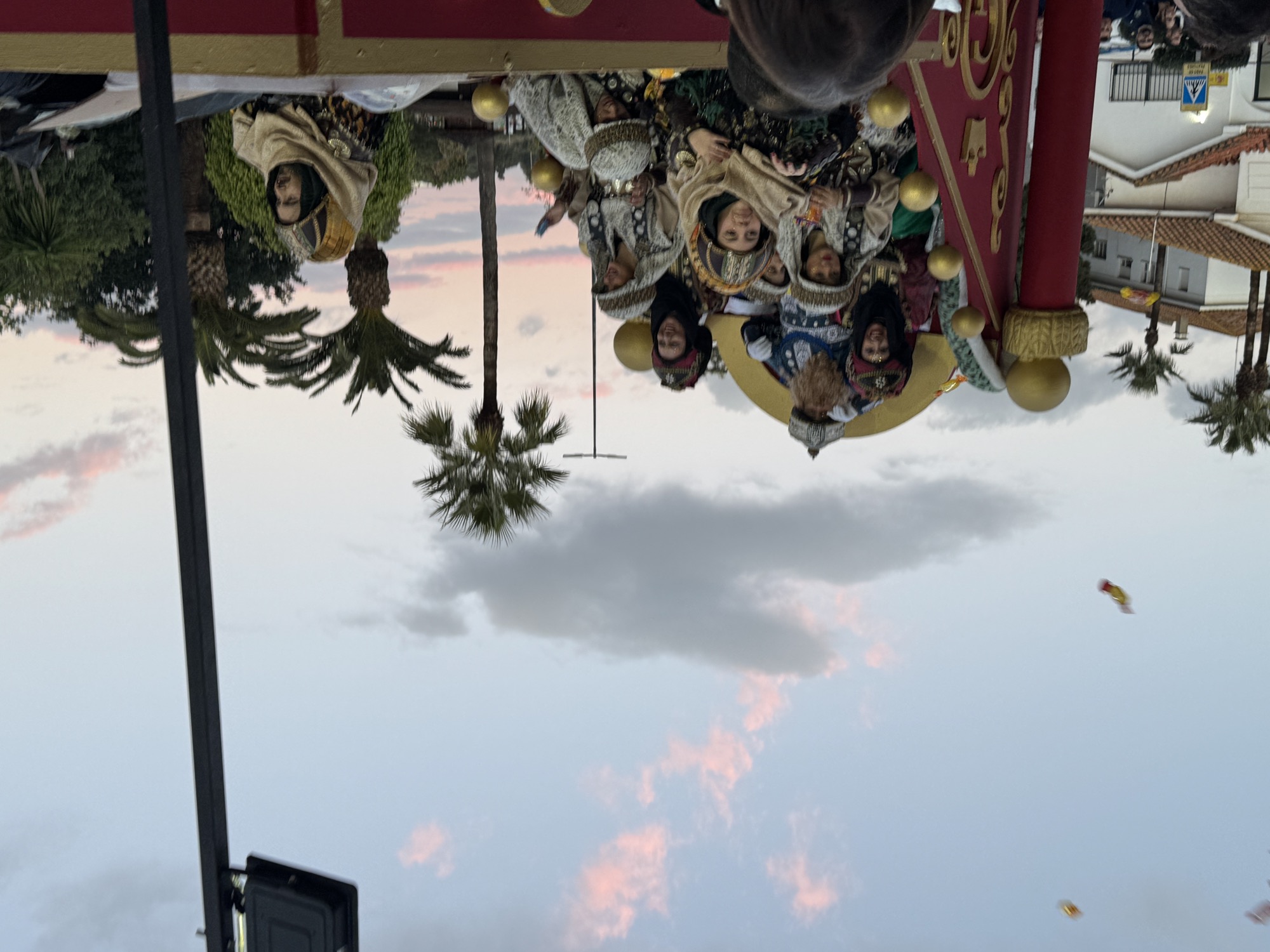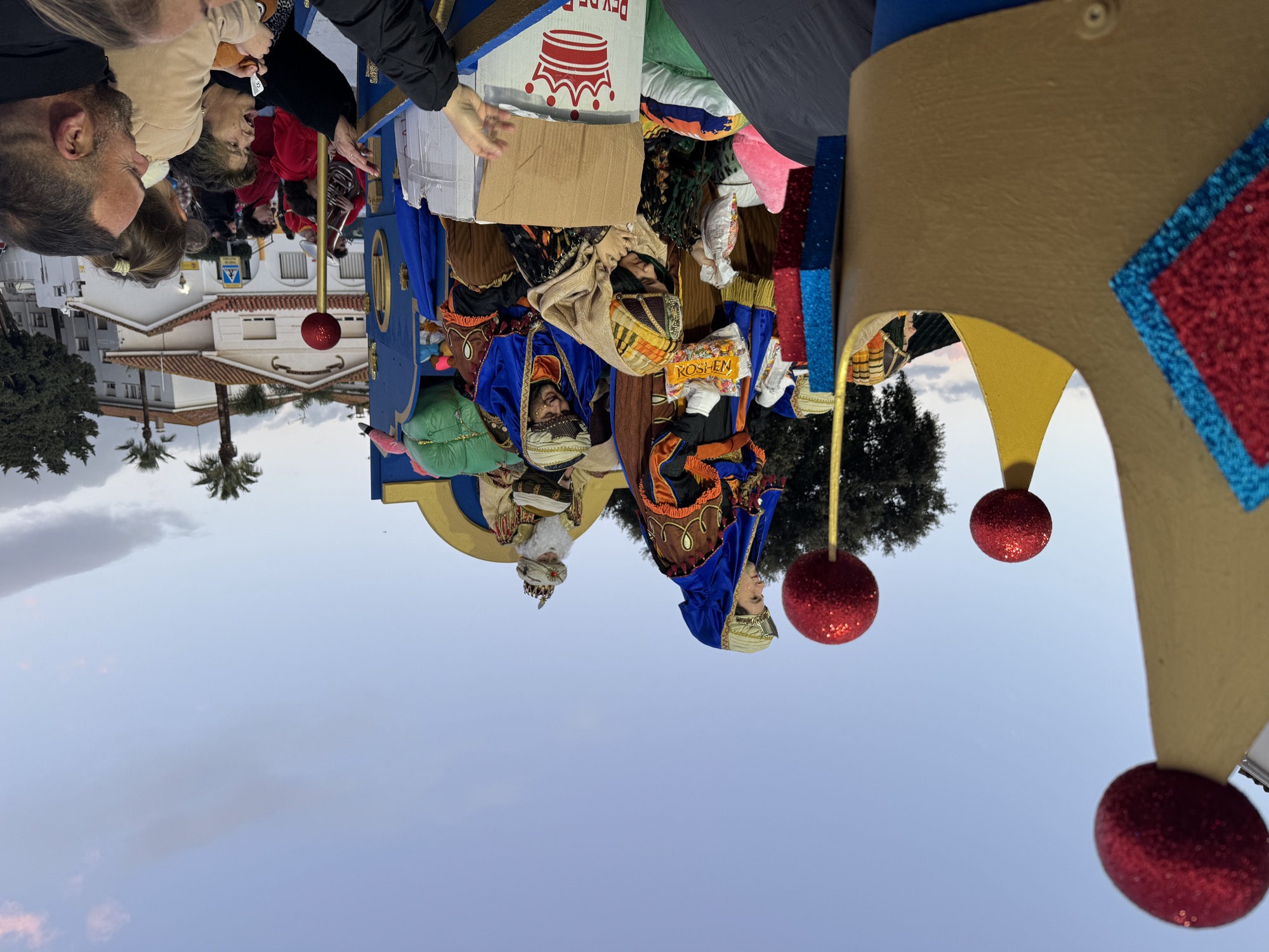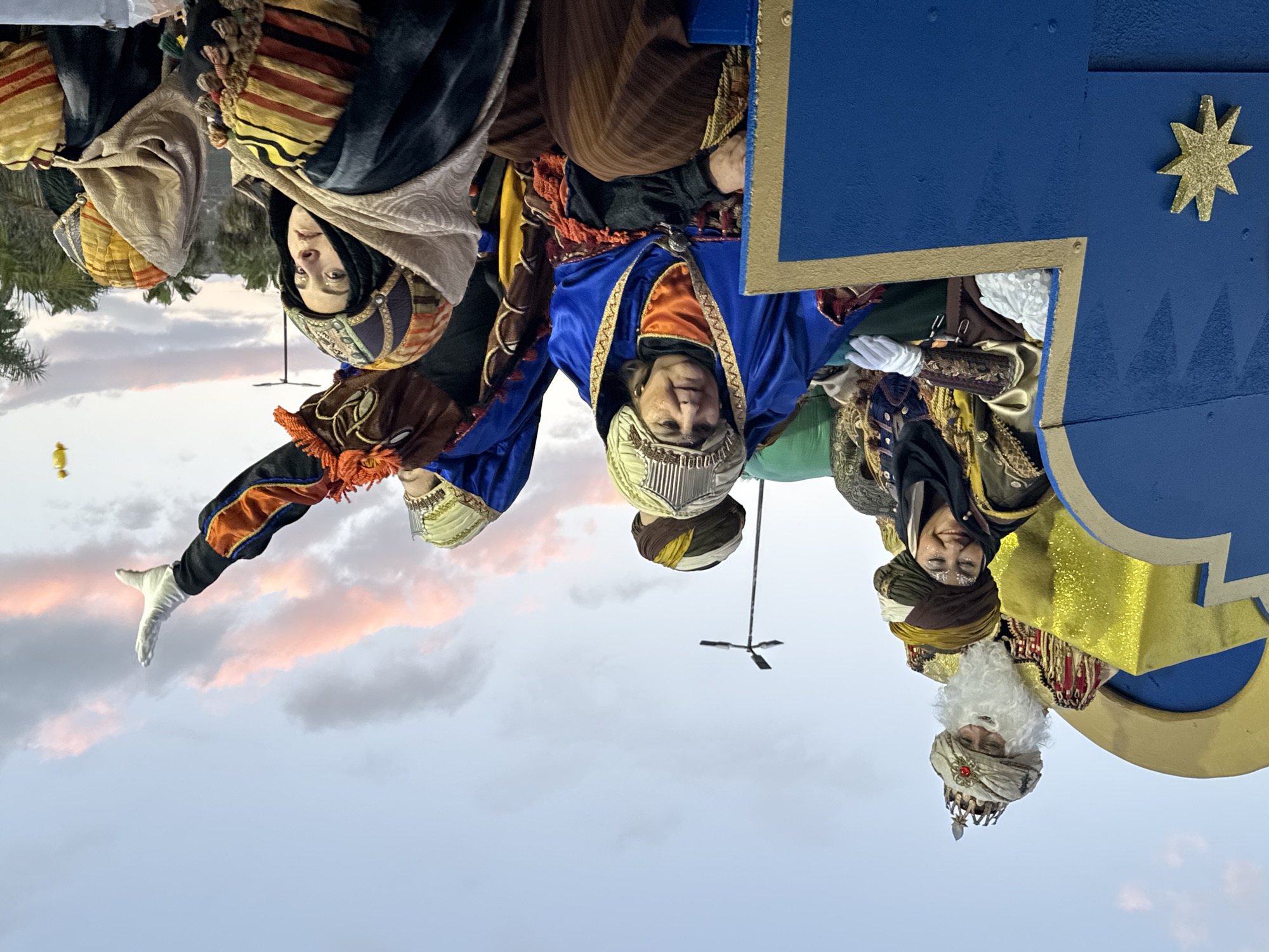 El cortejo lo cerraron Melchor, Gaspar y Baltasar en sus respectivas carrozas, acompañados de sus pajes, que, durante todo el camino fueron realizando regalos, papelillos, caramelos, balones y sobre todo, repartiendo ilusión