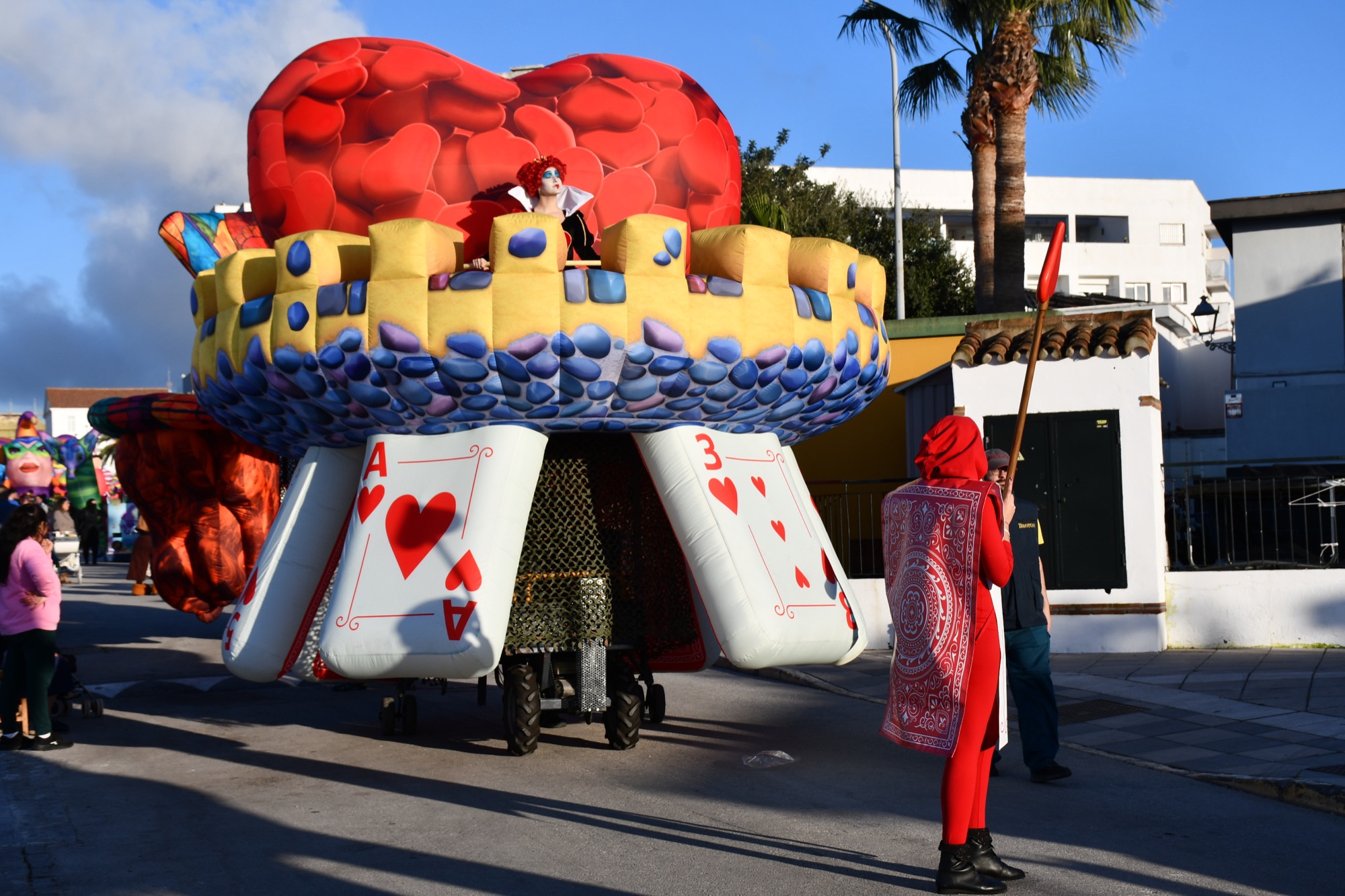 La Diosa del Carnaval, María García Roca, y su corte de Ninfas cerraban el desfile montadas en una carroza. Hubo siete pasacalles de gran colorido, como el espectacular integrado por personajes de Alicia en el País de las Maravillas, así como seis grupos musicales, entre bandas, charangas y una batucada.